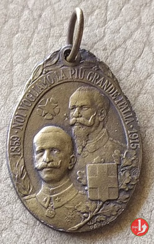 Noi vogliamo la piú grande Italia Dritto: 1859 • NOI VOGLIAMO LA PIU' GRANDE ITALIA • 1915 busti semi-sovrappisti di Vittorio Emanuele II e III in uniformi e decorazioni, entrambi con il collare della SS: Annunziata in basso, a sx: rami d'alloro in basso, a dx: Stemma Savoia su ramo di quercia a dx: monogramma in basso: PARIS | |