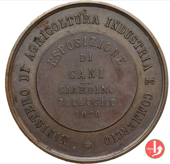 Esposizione di Cani 1916 Dritto: VITTORIO EMANUELE III RE D'ITALIA testa nuda a sx in basso: REGIA ZECCA nel campo, entro patera: ESPOSIZIONE = DI = CANI = - = GIARDINO = ZOOLOGICO = 1916 | |