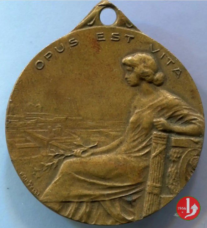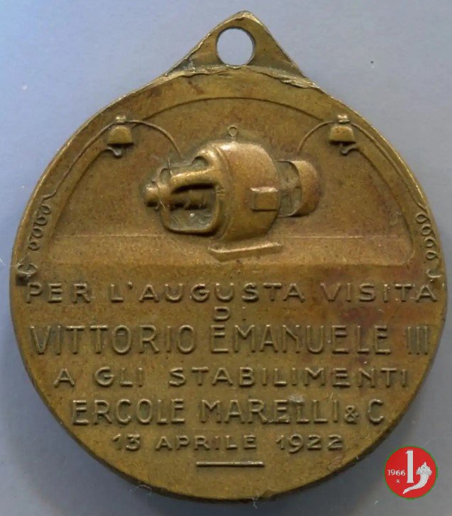 Stabilimenti Ercole Marelli 13-04-1922 Dritto: OPVS EST VITA figura femminile seduta verso sx regge fascio e ramo d'alloro e mira lo Stabilimento Marelli Grandi Costruzioni a Sesto San Giovanni sullo sfondo in basso a sx: DONZELLI sotto: PER L'AUGUSTA VISITA = DI = VITTORIO EMAUELE III = A GLI STABILIMENTI = ERCOLE MARELLI & C. = 13 APRILE 1922 = - | |