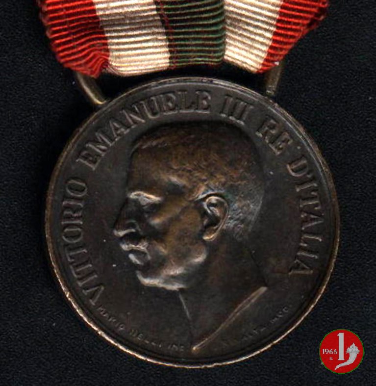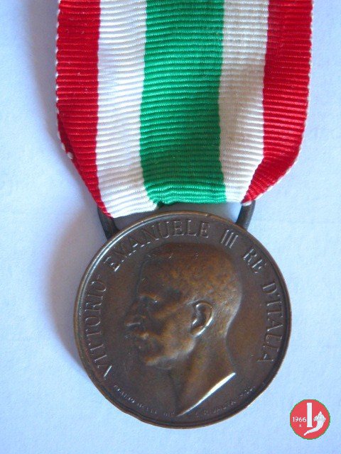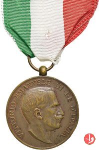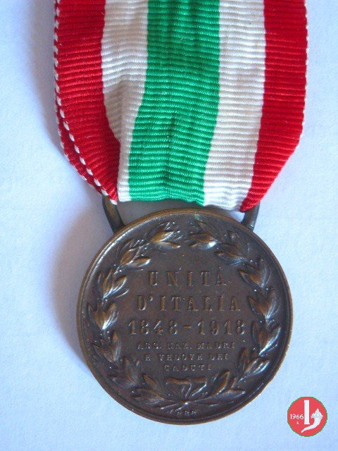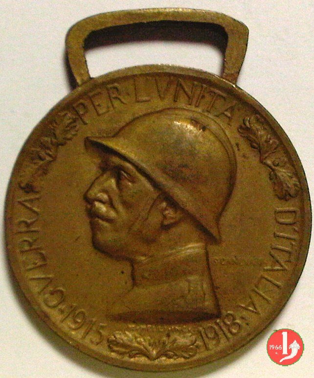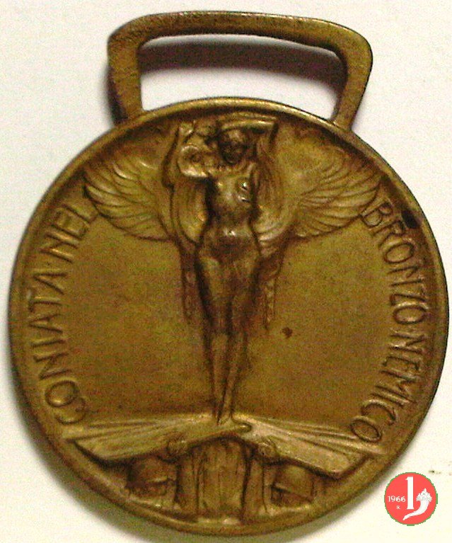 Decorazione Guerra per Unità d'Italia Dritto: GVERRA (alloro) PER • L'VNITA' (alloro) D'ITALIA = • 1915 (alloro) 1918 • busto elmato a sx con divisa nel campo, a sx: S. CARNEVARI sotto: • M NELLI • INC • figura alata allegorica della Vittoria di fronte su scudi sorretti da militari elmati | |