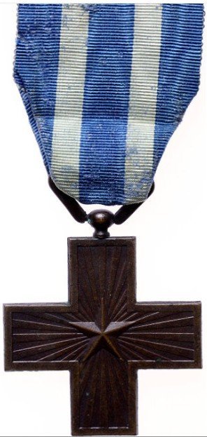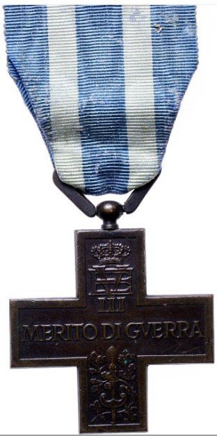 Croce al Merito di guerra Dritto: in alto: monogramma di Vittorio Emanuele III coronato al centro: MERITO DI GUERRA sotto: Spada e ramo d'alloro | |