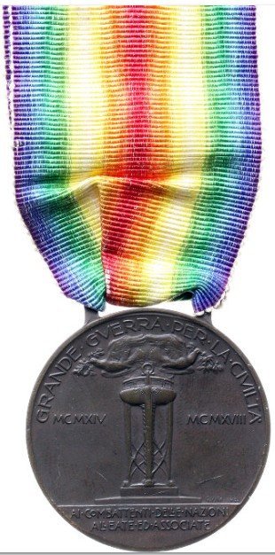 Decorazione per Soldati Nazioni Alleate Dritto: GRANDE GVERRA PER LA CIVILTA' braciere ardente sormontato da colombe in volo recanti rami di ulivo ai lati: MCMXIV _ MCMXVIII a dx, sopra alla linea dell'esergo: G. VILLA INC. (anche senza) in esergo: AI • COMBATTENTI • DELLE • NAZIONI = ALLEATE • ED • ASSOCIATE in esergo: vedi note | |