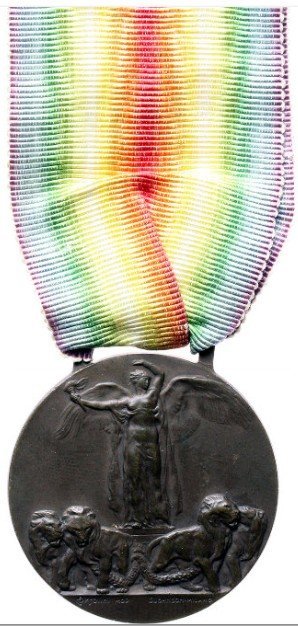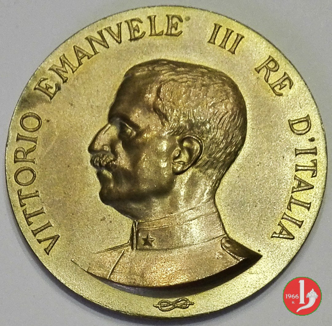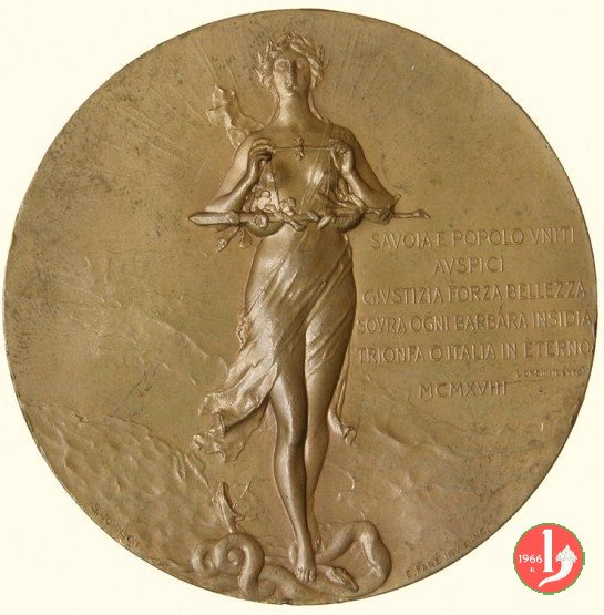Vittoria Italiana della guerra Dritto: VITT. EMAN. III _ RE D'ITALIA busto di fronte in uniforme e col collare dell'Annunziata in basso a dx: E. FARE' INC. nel campo a dx: SAVOIA E POPOLO VNITI = AVSPICI = GIVSTIZIA FORZA E BELLEZZA = SOVRA OGNI BARBARA INSIDIA = TRIONFA O ITALIA IN ETERNO = L. ORSINI = MCMXVIII in basso a sx: S. JOHNSON in basso a dx: E. FARE' INV. E INC. | |
