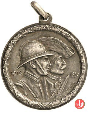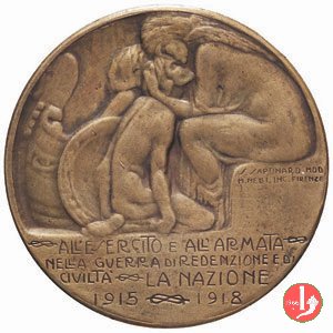 All'Esercito e All'Armata Dritto: VITTORIO EMANUELE III _ RE D'ITALIA busto a sx con uniforme in esergo: ALL'ESERCITO E ALL'ARMATA # = NELLA GUERRA DI REDENZIONE E DI = CIVILTA' # LA NAZIONE = 1915 # 1918 nel campo a dx, sotto alla seduta: S. SAPONARO MOD. = M. NELLI INC. FIRENZE # = nodo d'amore | |