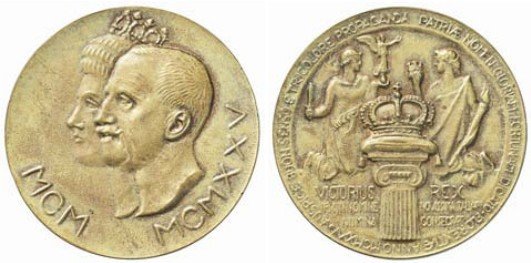 25° di Regno -Vittorio Emanuele III e Elena Dritto: busti accollati di Vittorio Emanuele III e della Regina Elena con diadema, a sx in basso: MCM _ MCMXXV in basso a dx: Picchiani Due figure allegoriche: una regge coltello e la vittoria alata, l'altra corona turrita e torcia , ai lati di semicolonna ionica recante la corona d'Italia su cuscino ai lati: VICTORIVS _ REX = IP SONNOMINE = NUMINA _ REX = NOVISSIMA = CONSECRAT | |