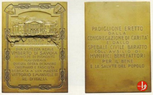 Padiglione Crongregazione della Carità Schio Dritto: entro cornice di nodi d'amore con, negli angoli in alto, Stemmi Savoia e Fascista: Prospetto anteriore di edificio su ramo d'alloro sotto: SCHIO = XX • IX • MCMXXIX • A • VII in basso: SVA ALTEZZA REALE = VMBERTO DI SAVOIA = PRINCIPE DI PIEMONTE = INAVGVRAVA = QVESTA OPERA DI AMORE = CRISTIANO E FASCISTA = DEDICATA A SVA MAESTA' = VITTORIO EMANVELE III = RE D' ITALIA in basso a dx: LANDI | |