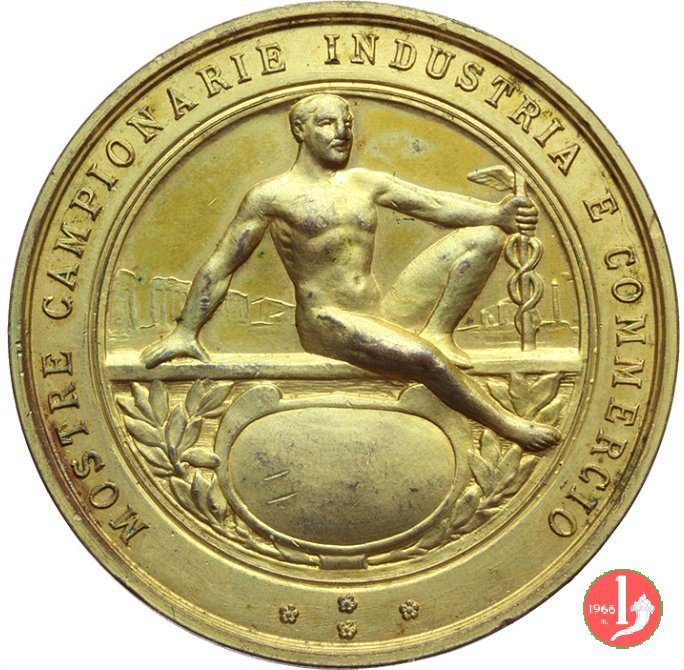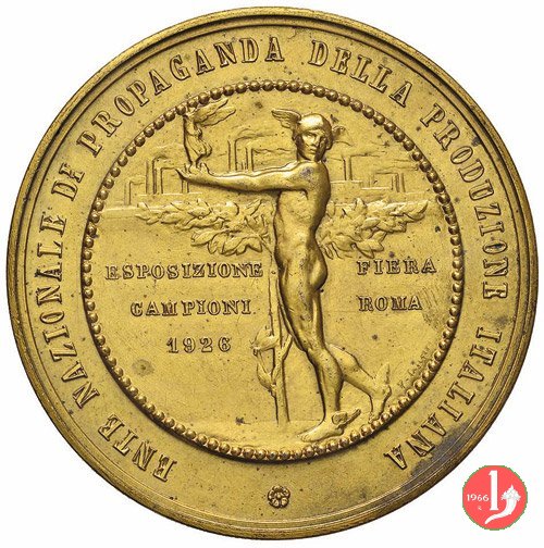 Ente Naz. Propaganda della Produz. Italiana Dritto: VITTORIO EMANUELE III _ RE D'ITALIA busto a sx con uniforme e collare della SS. Annunziata nel campo entro cerchio perlinato: Mercurio in piedi volto a sx regge la vittoria alata, sullo sfondo paesaggio industriale nel campo a sx: ESPOSIZIONE = CAMPIONI = 1926 nel campo a dx: FIERA = ROMA in basso a dx: P. TASIGLI (?) | |