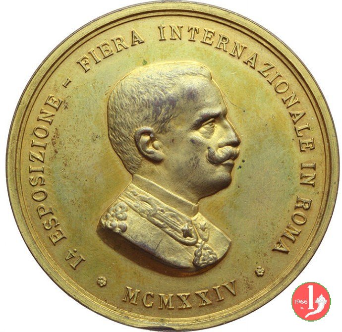 I° Fiera Internazionale di Roma Dritto: Ia ESPOSIZIONE - FIERA INTERNAZIONALE IN ROMA = * MCMXXIV * busto a dx con uniforme e collare dell'Annunziata figura maschile nuda seduta di 3/4 a dx regge caduceo, sullo sfondo vista dei Fori Imperiali in basso targa ovale, tra rami d'alloro | |