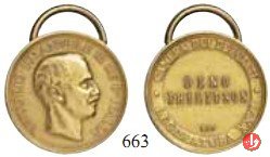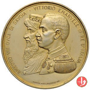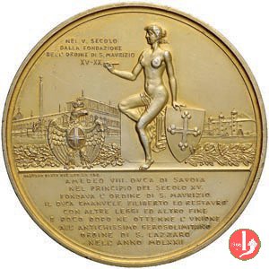 500° Ordine San Maurizio -UdS I-2 Dritto: AMEDEO VIII DI SAVOIA • VITTORIO EMANUELE III RE D' ITALIA busti accollati a sx di Vittorio Amedeo con turbante coronato e Vittorio Emanuele III con divisa militare e Croce Mauriziana e collare della SS. Annunziata in basso: GAETANO CALVI DIS. MOD. ED INC. sotto la linea dell'esergo, a sx: GAETANO CALVI DIS. MOD. ED INC. in esergo: AMEDEO VIII DVCA DI SAVOIA = NEL PRINCIPIO DEL XV SECOLO = FONDAVA L'ORDINE DI S. MAVRIZIO = IL DVCA EMANVELE FILIBERTO LO RESTAVRO' = CON ALTRE LEGGI ED ALTRO FINE = E POCO DOPO NE OTTENNE L' VNIONE = ALL' ANTICHISSIMO GEROSOLIMITANO = ORDINE DI S. LAZZARO = NELL'ANNO MDLXXII | |