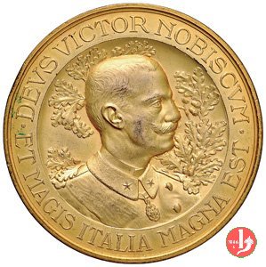Per la fine della Guerra Mondiale Dritto: DEVS VICTOR NOBISCVM = • ET MAGIS ITALIA MAGNA EST • busto a dx in divisa militare con il collare della SS. Annunziata e su rami di quercia cavallo rampante di 3/4 a dx su nubi, slegato da catene, cavalcato da cavaliere recante ramo di palma in basso: G. IACOANGELI INV. | |