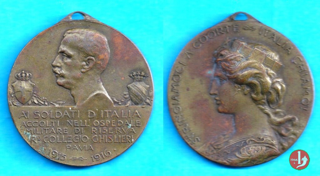 Ospedale Collegio Ghislieri Dritto: busto a sx tra stemma Savoia e Stemma Ghislieri coronati e tra rami d'alloro in esergo: AI SOLDATI D'ITALIA = ACCOLTI NELL'OSPEDALE = MILITARE DI RISERVA = R° COLLEGIO GHISLIERI = PAVIA sotto, circolarmente: • 1915 busto della figura allegorica dell'Italia turrita a sx | |