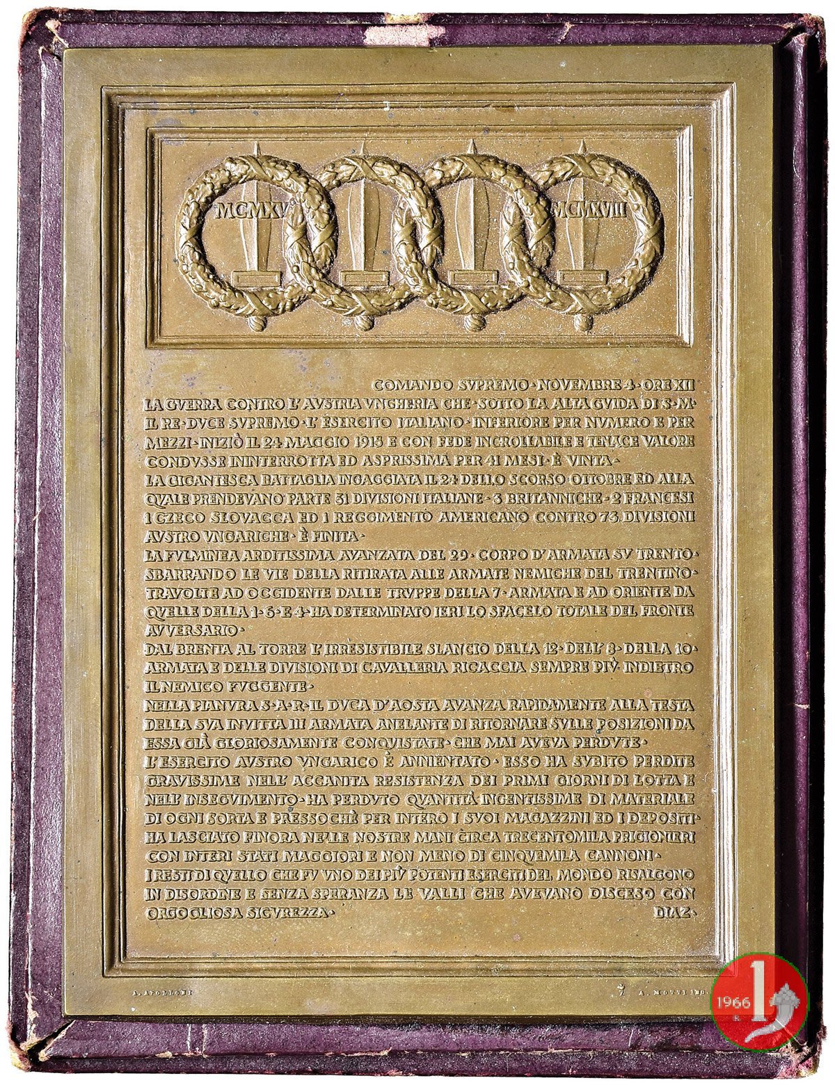Placchetta Comunicato della Vittoria del Gen. Diaz 1918 Dritto: in alto, entro riquadro: quattro gladi entro serti d'alloro, sugli esterni: MCMXV _ MCMXVIII nel campo: COMANDO SVPREMO • NOVEMBRE 4 • ORE XII = LA GVERRA CONTRO L'AVSTRIA VNGHERIA CHE • SOTTO L'ALTA GVIDA di S • M • = IL RE DVCE SVPREMO. L'ESERCITO ITALIANO INFERIORE PER NUMERO E PER = MEZZI in basso a dx: A. MOTTI INC. | |