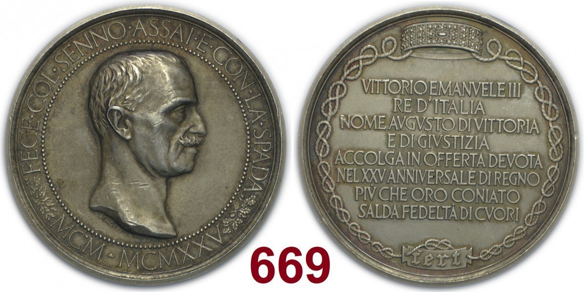 Giubileo Reale di Vittorio Emanuele III Dritto: FECE • COL • SENNO • ASSAI • E • CON • LA • SPADA = tra rami di quercia MCM - MCMXXV entro cerchio perlinato: Busto nudo a dx sotto: A. MOTTI | |