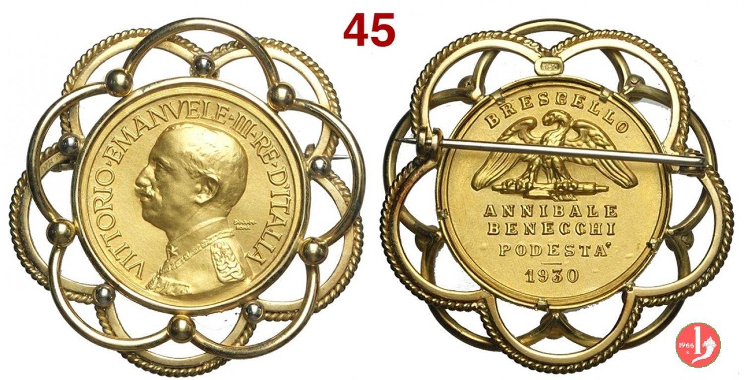 Brescello - Podestà Annibale Benecchi Dritto: CITTORIO • EMANVELE • III • RE • D'ITALIA busto a sx con divisa e collare della SS. Annunziata nel campo a dx: S.I.A.M. = ROMA Aquila ad ali spiegate regge fascio orizzontale con artigli sotto: ANNIBALE = BENECCHI = PODESTA' = - = 1930 | |