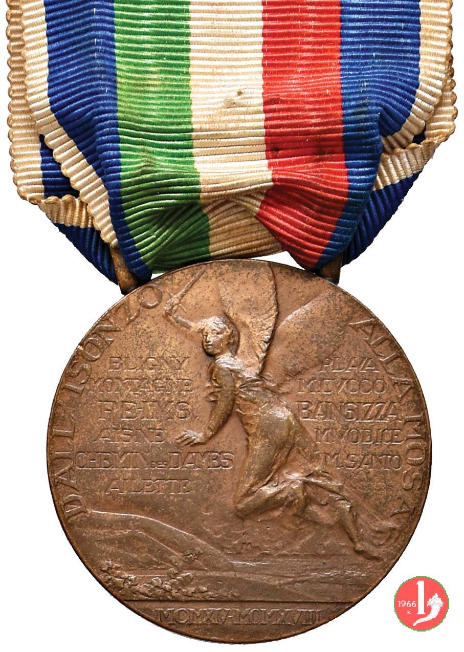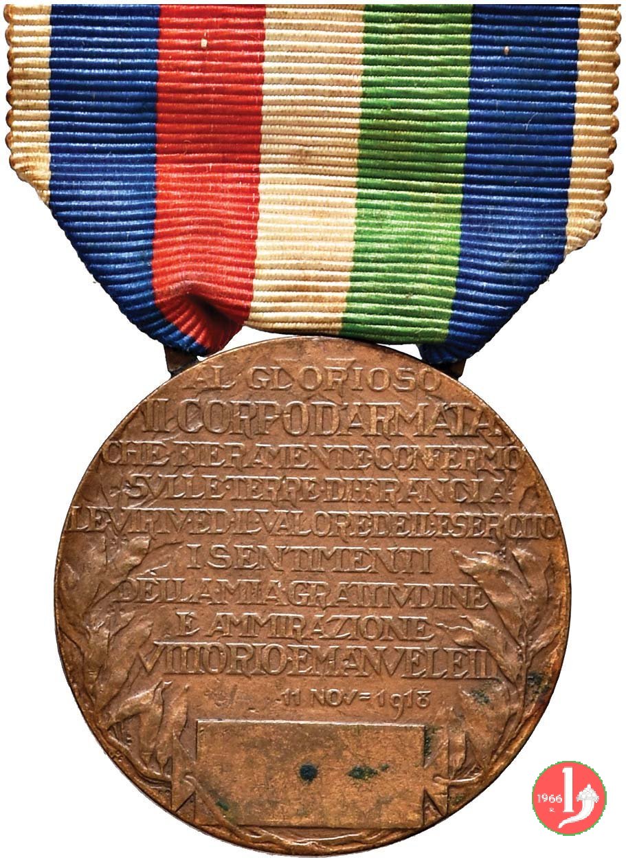 Al II Corpo d'Armata in Francia 1918 Dritto: DALL' ISONZO _ ALLA MOSA la figura allegorica della Vittoria alata volta a sx, regge spada su paesaggio nel campo: BLIGNY _ PLAYA = MONTAGNE _ M.CVCCO = REIMS _ BANGIZZA = AISNE _ MIVOBICE = CHEMIN DES DAMES _ M. SANTO = AILETTE in esergo: MCMXV-MCMXVII in basso: targa | |