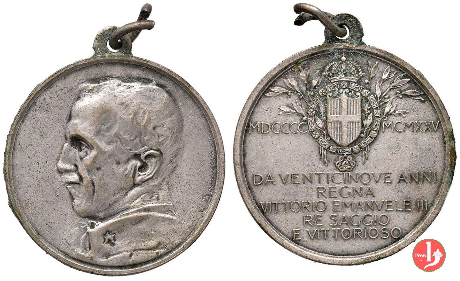 Giubileo Reale di Vittorio Emanuele III Dritto: 1900 _ 1925 busto di fronte in uniforme col collare dell'Annunziata in basso a dx: S.J. | |
