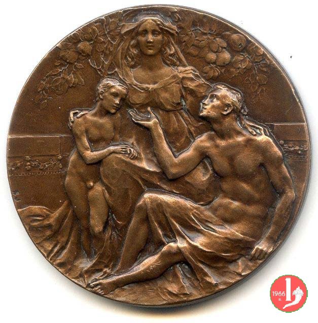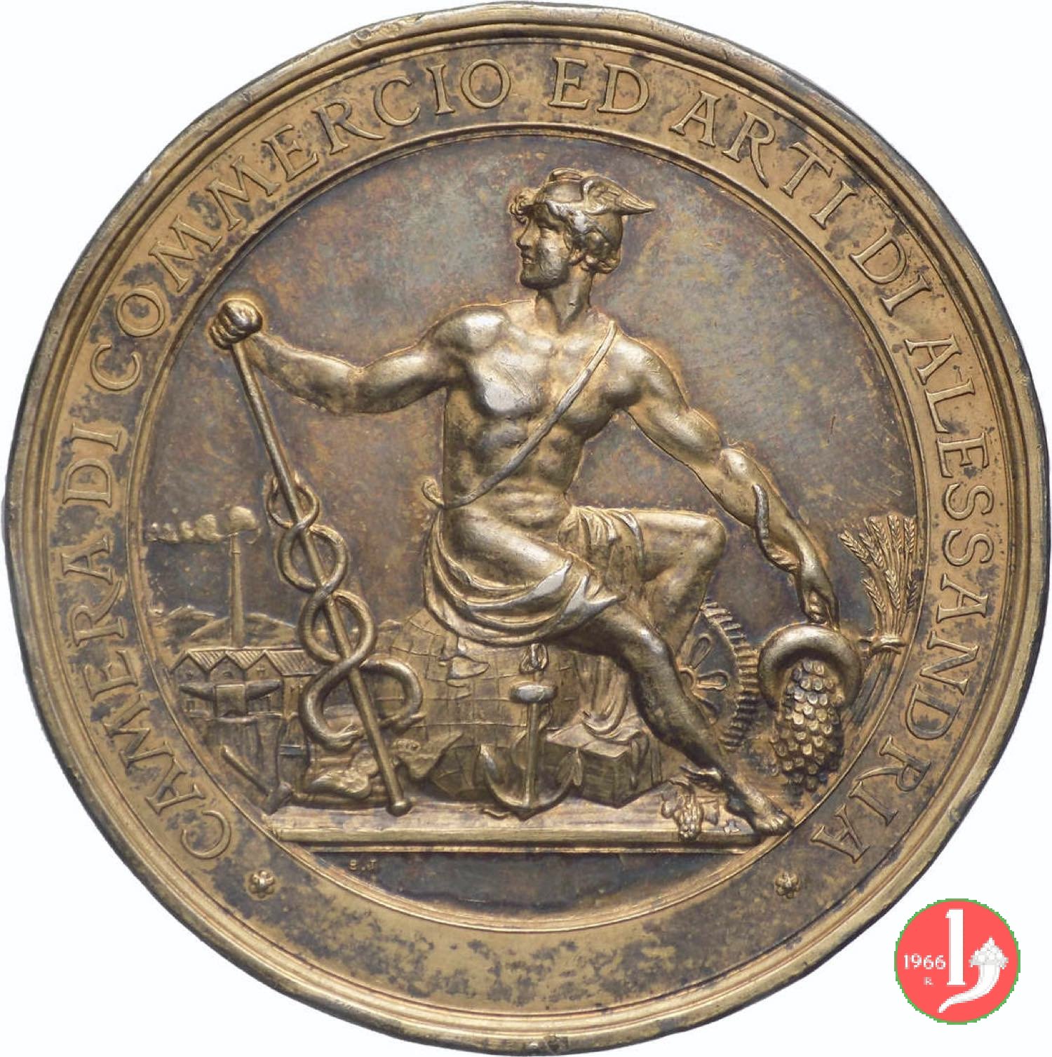 ai lati: caduceo con elmo alato, aratro con spiga, incudine con martello e ruota dentata, grappolo d'uva