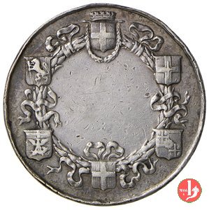 Dritto: figura allegorica di Alessandria seduta di fronte regge caduceo e si appoggia allo stemma turrito della Città di Alessandria entro festoni d'alloro; ai suoi piedi cornucopia con monete e sullo sfondo, tra rami d'alloro, Stemmi delle Città del Piemonte