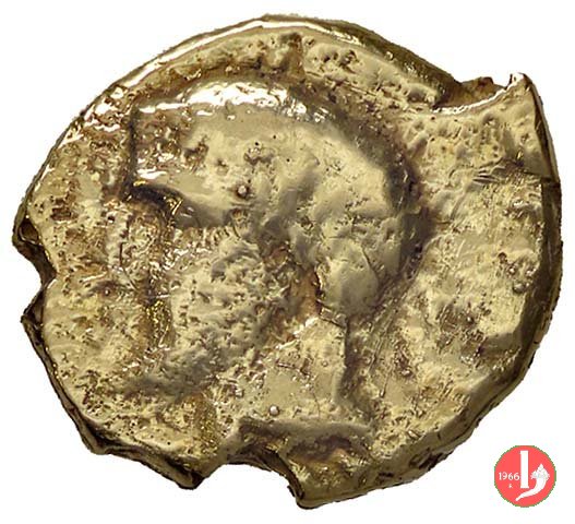 Dritto: figura maschile in piedi di fronte e volta a sx, presso leone gradiente a dx, regge statuetta di Ecole