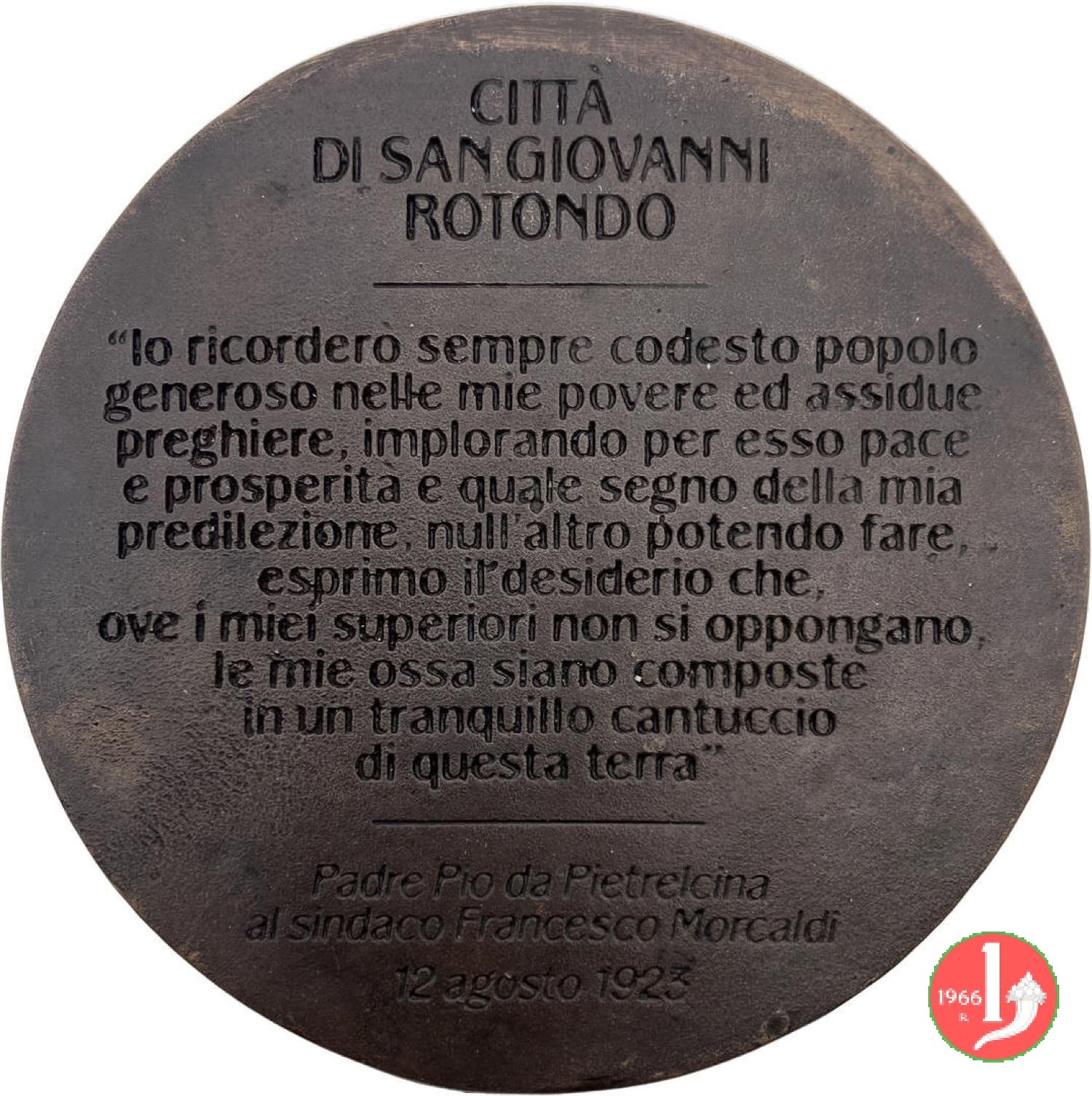 Verso: in alto: CITTA' = DI SAN GIOVANNI = ROTONDO = - = "IO RICORDERO' SEMPRE CODESTO POPOLO = GENEROSO NELLE MIE POVERE ED ASSIDUE = PREGHIERE, IMPLORANDO PER ESSO PACE = E PROSPERITA' E QUALE SEGNO DELLA MIA = PREDILEZIONE, NULL'ALTRO POTENDO FARE, = ESPRIMO IL DESIDERIO CHE, = OVE I MIEI SUPERIORI NON SI OPPONGANO, = LE MIE OSSA SIANO COMPOSTE = IN UN TRANQUILLO CANTUCCIO = DI QUESTA TERRA" = - = PADRE PIO DA PIETRELCINA = AL SIDACO FRANCESCO MORCALDI = 12 AGOSTO 1925