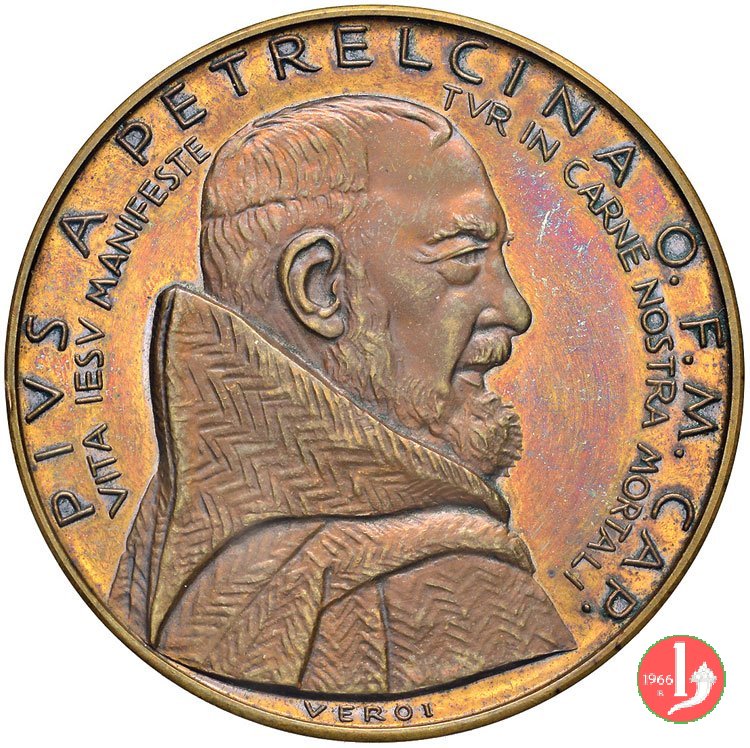 busto di San Padre Pio di 3/4 a dx con saio tra gli stemmi di San Giovanni Rotondo, della Provincia di Foggia, di Pietralcina e delle VITTIME DEL DOVERE D'ITALIA