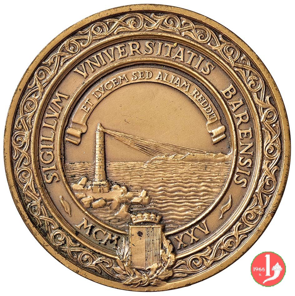 Dritto: entro cornice a fregi con girali e doppio cerchio continuo: SIGILLUM UNIVERSITATIS BARENSIS = - MCM _ XXV -