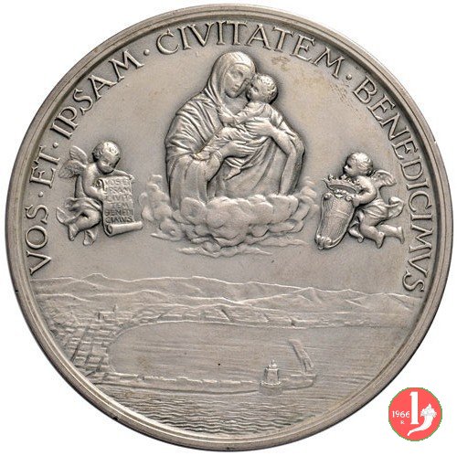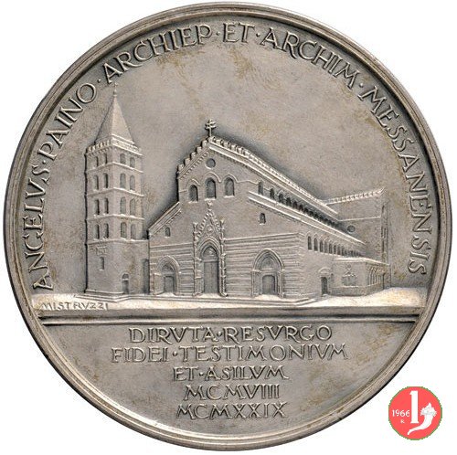 Restauro del Duomo 1929 Dritto: ANGELVS • PAINO • ARCHIEP • ET • ARCHIM • MESSANENSIS vista del Duomo di Messina sulla linea dell'esergo a sx: MISTRVZZI in esergo: DIRVTA • RESVRGO = FIDEI • TESTIMONIVM = ET • ASILVM = MCMVIII = MCMXXIX busto della B. V. Madonna della Lettera col Bambino su nubi tra due Angeli recanti uno la lettera e l'altro lo Stemma della Città, sul panorama della Città visto dal porto | |