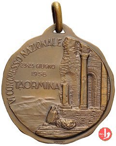Soc. Italiana Chirurgia Toracica 1958 Dritto: SOCIETA' ITALIA DI CHIRURGIA TORACICA busto di Venere con piccoli elementi geometrici sovrapposti nel campo, a sx: 23 • 25 GIUGNO = 1958 = TAORMINA vista dei resti del Teatro Greco di Taormina in basso: LORIOLI | |