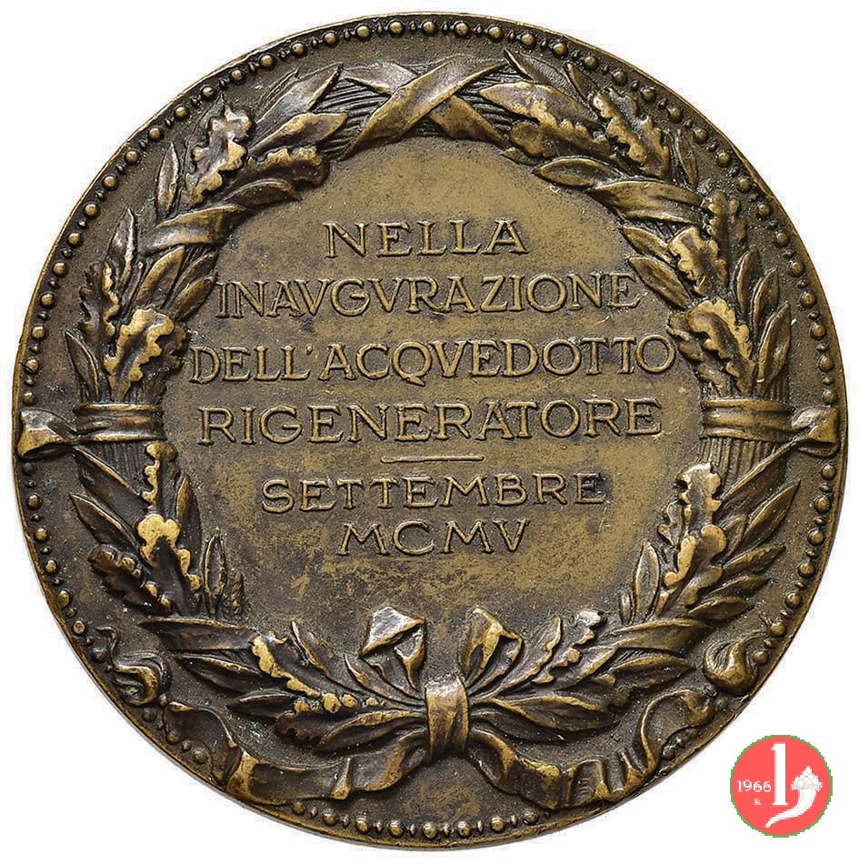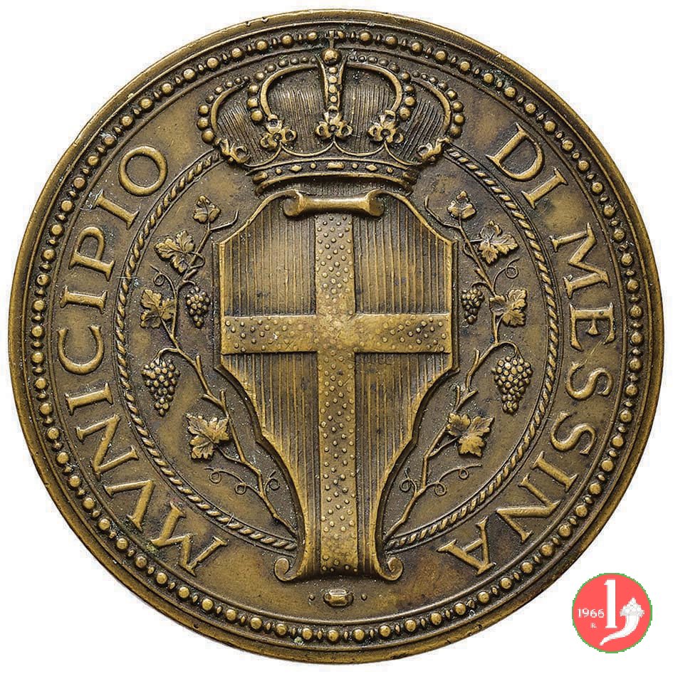 Inaugurazione dell'Acquedotto 1905 Dritto: MVNICIPIO _ DI MESSINA entro festone circolare: Stemma coronato tra tralci di vite | |