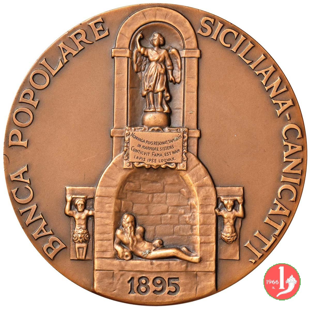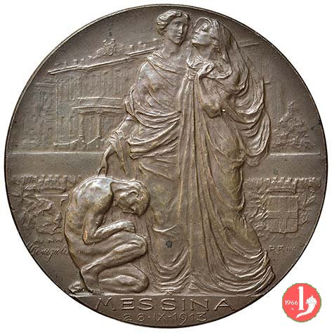Terremoto di Messina 1908 Dritto: figura femminile allegorica velata, seduta a sx e volta a dx, regge ancora e mira figura allegorica maschile in alto a dx rivolta verso il basso, in basso a dx figura maschile riceve massi e sullo sfondo vista della Città di Messina sulla linea dell'esergo, a dx: POGLIAGHI in esergo: MESSINA XXVIII DICEMBRE MCMVIII in basso a sx: S. JOHNSON AC nel campo: A E. PILAJA = CHE VISTO L'ANNVNCIO FVNESTO = DA CATANIA SVA = ACCORSE ALLA CITTA' DESOLATA = NELLO SPONTANEO ACCOMPIMENTO = D'ALTISSIMO DOVERE = RACCOGLIENDO IL PREMIO PIU' AMBITO = LA BANCA COMMERCIALE ITALIANA = CON GRATITVDINE DONA =... | |