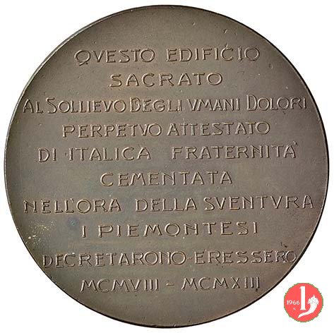 Ospedale dei Piemontesi 1913 Dritto: due figure allegoriche, drappeggiate, in piedi, presso figura sofferente e genuflessa, sullo sfondo il nuovo Ospedale dei Piemontesi ai lati, su rami d'alloro: Stemmi coronati di Torino e Messina nel campo, in basso, a sx: CERAGIOLI nel campo, in basso, a dx: R.A INC. in esergo: MESSINA = 28 • IX • 1913 | |