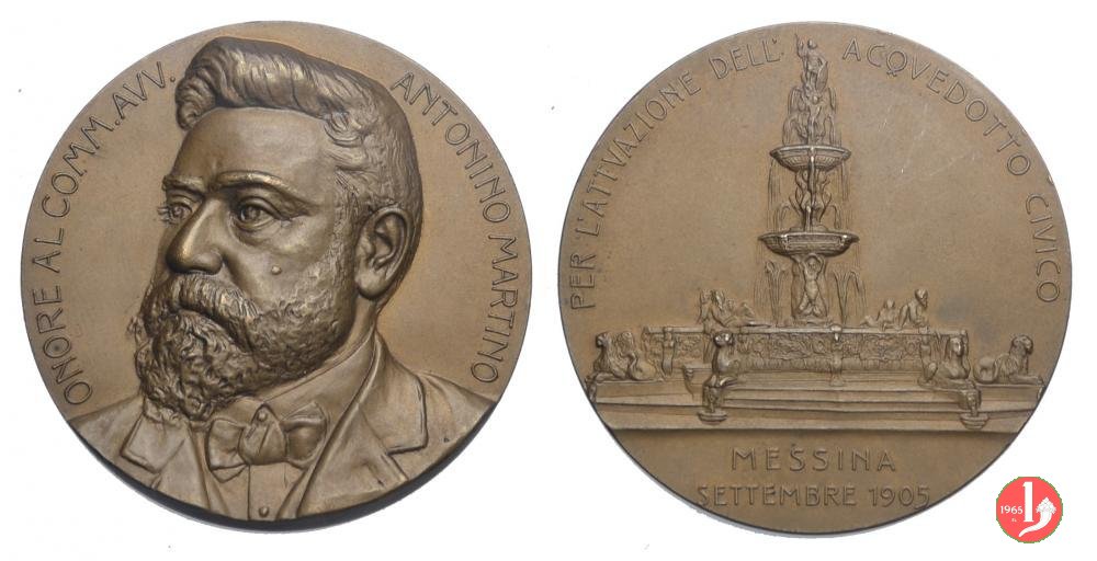 Attivazione Acquedotto di Messina 1905 Dritto: ONORE AL COMM. AVV. _ ANTONIO MARTINO busto di 3/4 a sx con barba, giacca, camicia e papillon prospetto della Fontana di Orione a Messina in esergo: MESSINA = SETTEMBRE 1905 | |