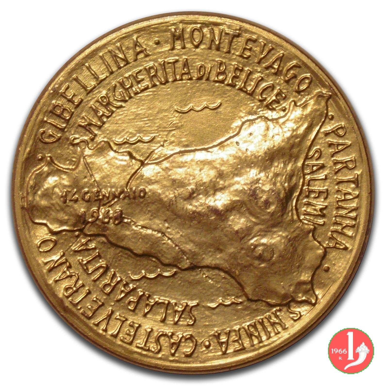 Terremoto del Belice 1968 Dritto: busto di donna velato a sx guarda albero rinsecchito ed edificio in rovina in basso: S. GIANDOMENICO nel secondo cerchio: S. MARGHERITA DI BELICE _ SALEMI _ SALAPARUTA • Planimetria della Sicilia con indicato l'epicentro e la data 14 GENNAIO = 1969 | |