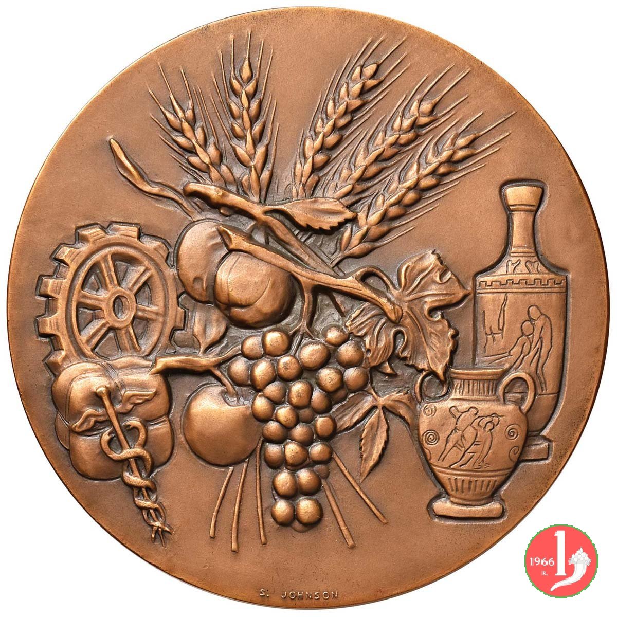 testa del dio Apollo laureata a dx entro rilievo con arco ribassato e tra fregi geometrici: la figura allegorica dell'Agricoltura seduta a sx regge falce tra frutti e sullo sfondo il Palazzo delle Esposizioni | |