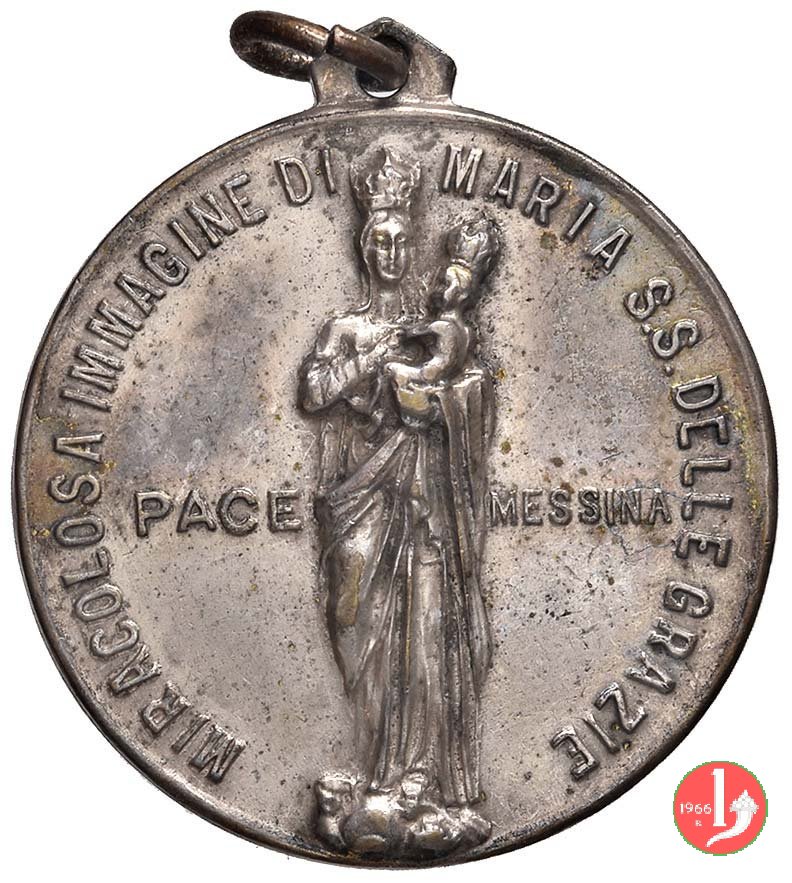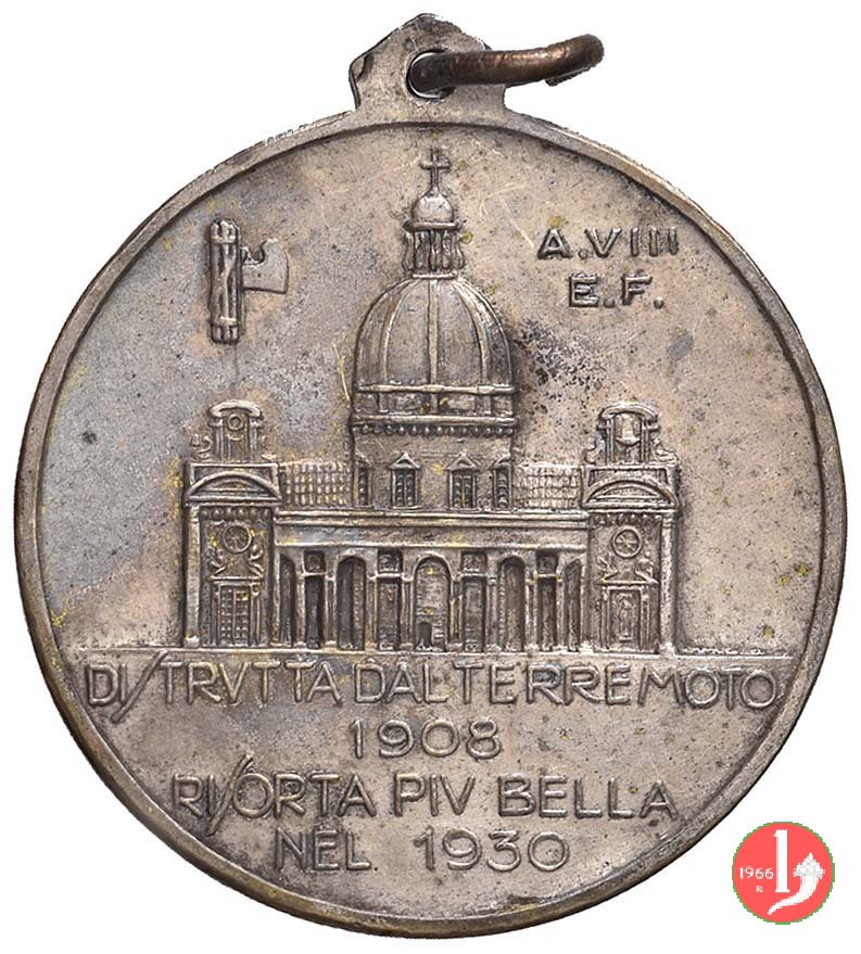 Ricostruzione Chiesa Maria Santissima delle Grazie di Messina 1930 -C- Dritto: MIRACOLOSA IMMAGINE DI _ MARIA S.S.S DELLE GRAZIE la B. V. Maria coronata, in piedi, di fronte, regge il bambino coronato ai lati: PACE _ MESSINA in alto: fascio verticale con lama a dx _ A. VIII = E.F. in esergo: DISTRUTTA DAL TERREMOTO = 1908 = RISORTA PIV' BELLA = NEL 1930 | |
