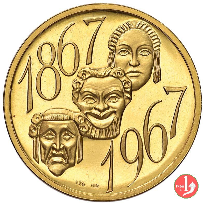 Luigi Pirandello 1967 Dritto: LVIGI PIRANDELLO bustoa dx ai lati: 1867 _ 1967 sotto: AFFER Scenografia sormontata da maschera tra nastri in esergo: serto d'alloro | |