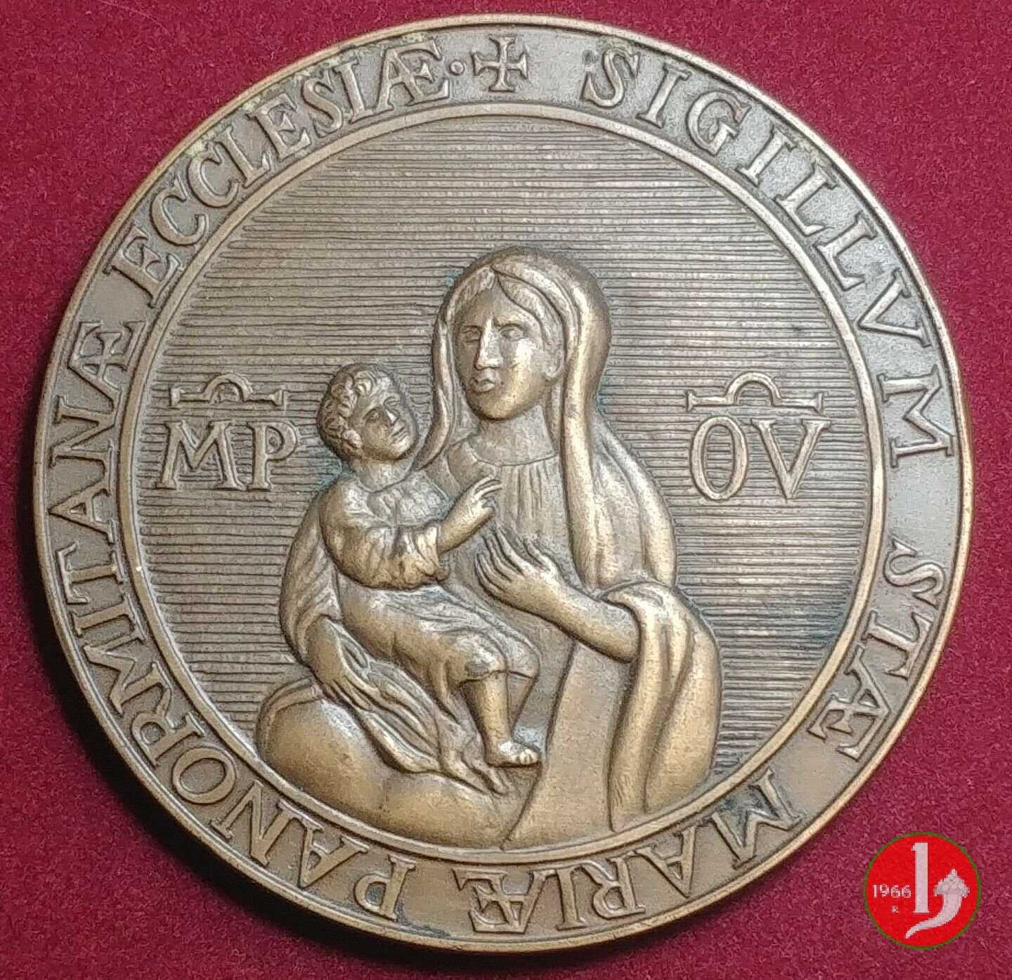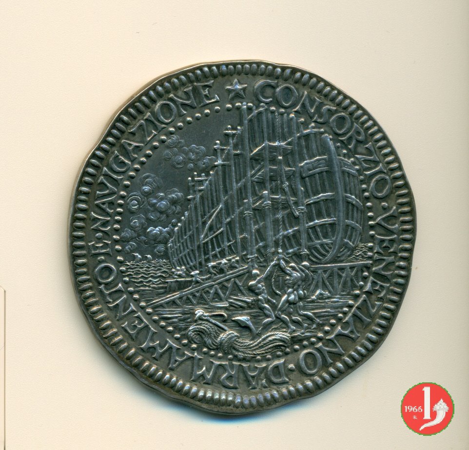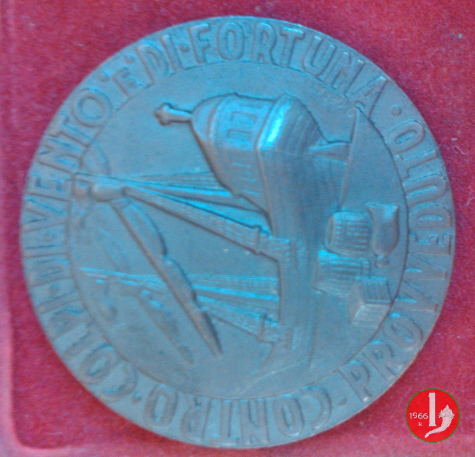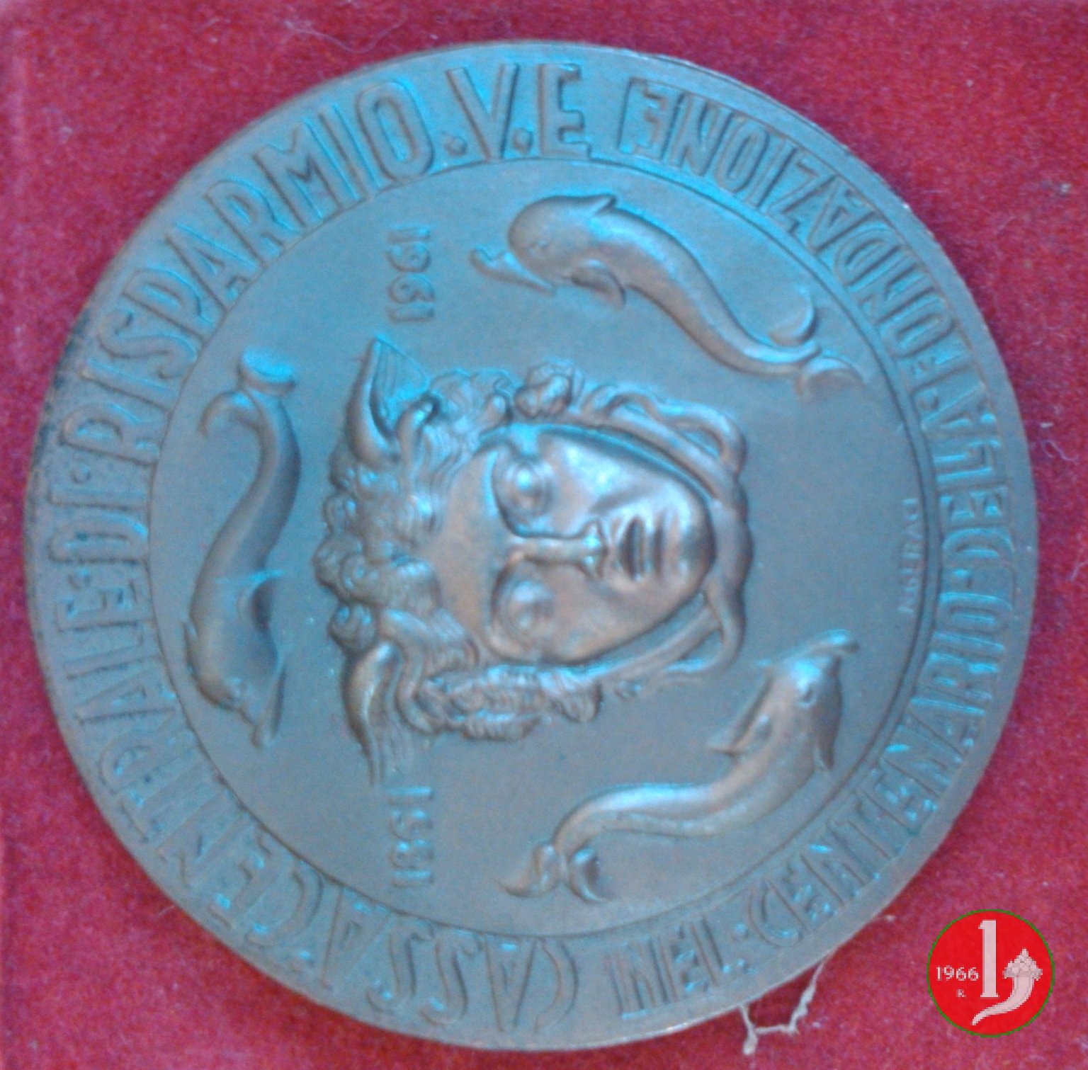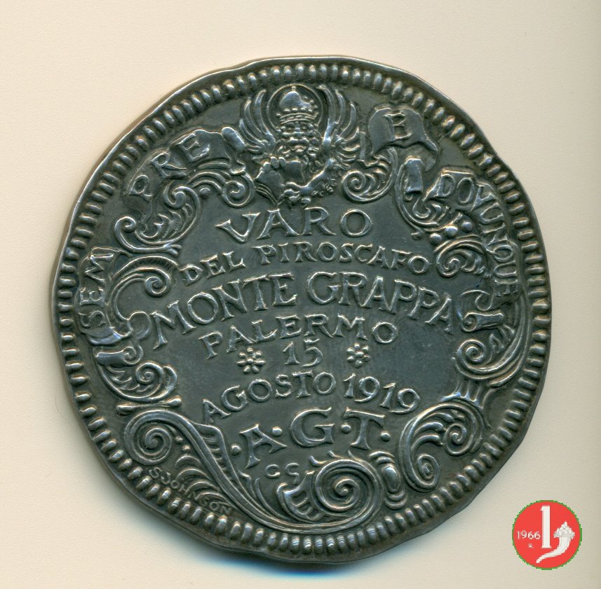 Reverse: La medaglia si trova incastonata su un supporto metallico, bronzo/ottone placcato in argento. Il verso originale è pertanto nascosto. Sul supporto è riportato il nome dell'Autore "SALVATORE FIUME"