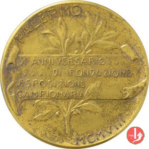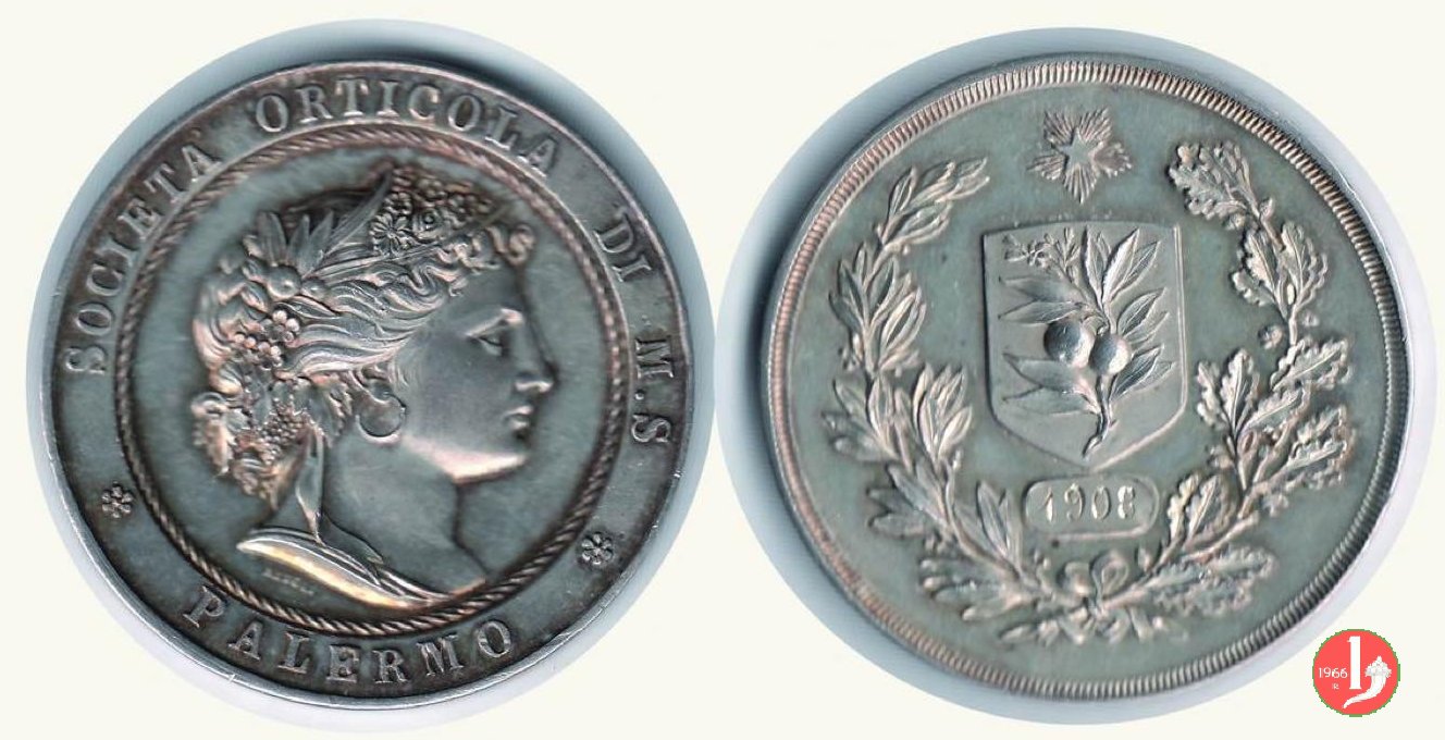 Reverse: logo in scudetto della Società Orticola palermitana sormontato da stella raggiante, su targa incisa 1908 e tra rami d'alloro e quercia legati in basso da nastro