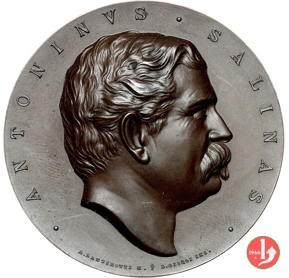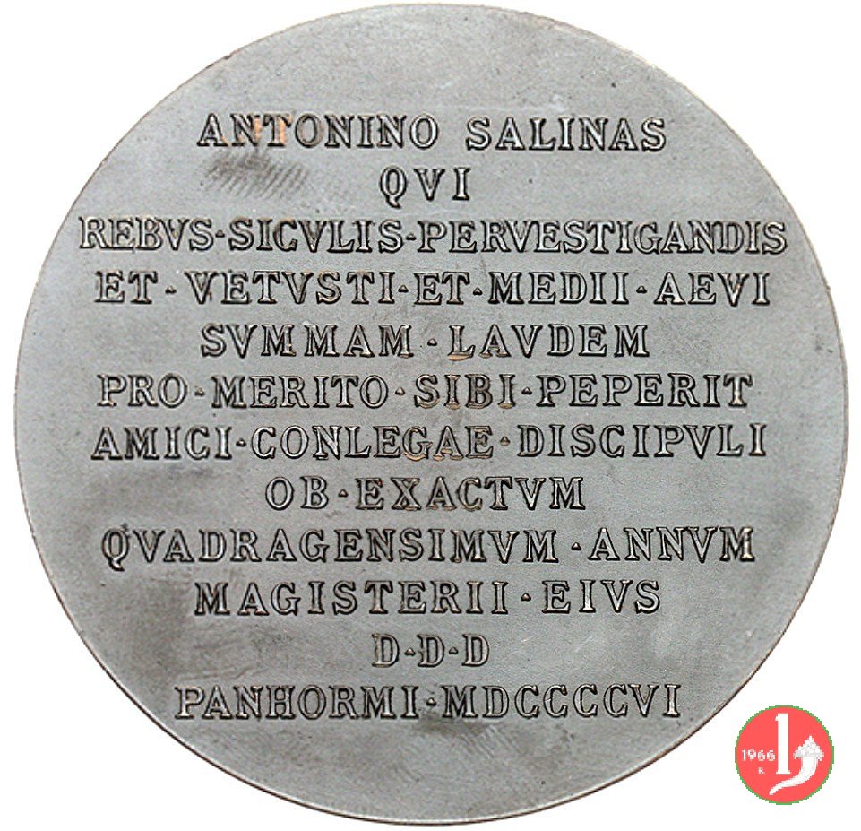 Reverse: nel campo: ANTONINO SALINAS = QVI = REBVS • SICVLIS • PERVESTIGANDIS = ET • VETVSTI • ET • MEDII • AEVI = SVMMAM • LAVDEM = PRO • MERITO • SIBI • PEPERIT =