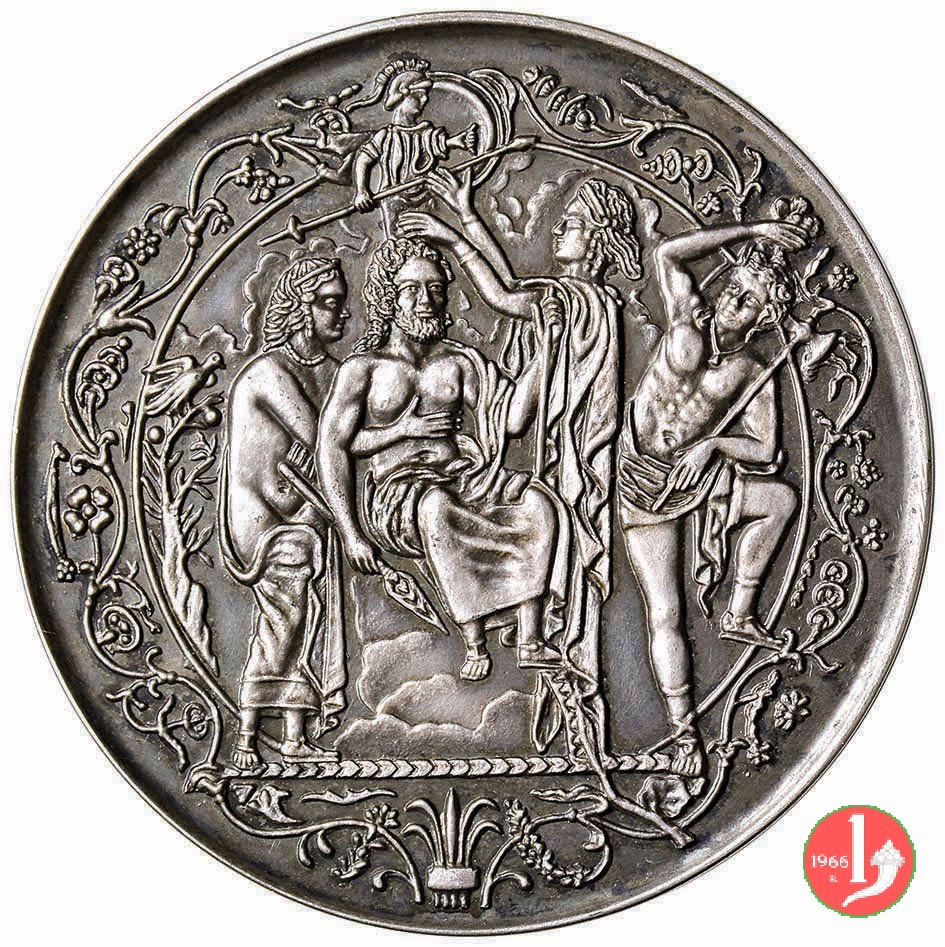 Reverse: Scena allegorica con quattro figure entro ampia cornice floreale