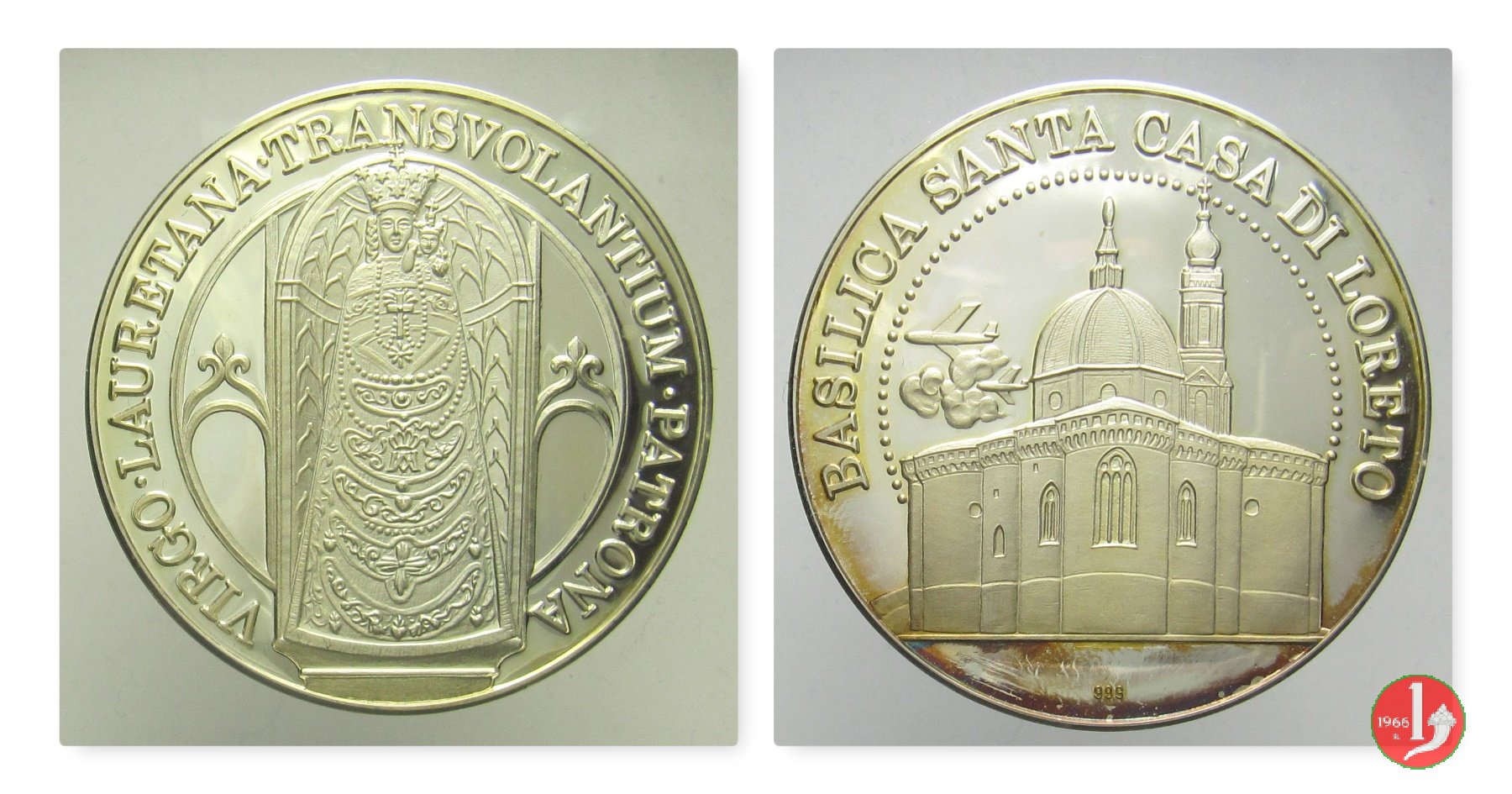 Vergine Patrona degli Aviatori Obverse: VIRGO • LAURETANA • TRANSVOLATIUM • PATRONA La B. V. Maria con dalmatica, regge il Bambino Gesú, entro arco decorato a piume e tra due arcate fogliate, su cornice circolare interrotta in basso entro cerchio perlinato interrotto in basso: due Aerei in volo verso sx tra le nubi e sul Santuario della Santa Casa | |