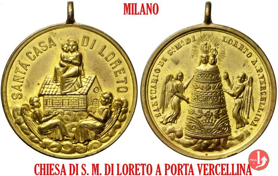 Santa Casa di Loreto e Santuario a Porta Vercellina Obverse: SANTA CASA _ DI LORETO la Santa Casa sorretta tra nubi da due Angeli e sormontata dalla Madonna seduta che regge il Bambino Gesu la Madonna di Loreto coronata e con volto raggiante, in piedi e di fronte, con dalmatica e col Bambino Gesú, tra due Angeli, su nubi | |