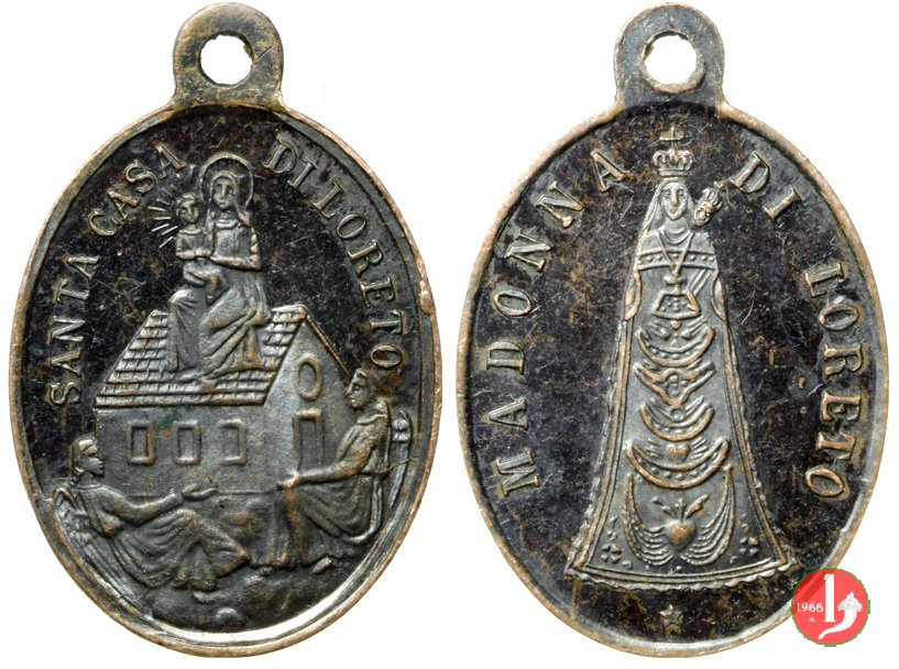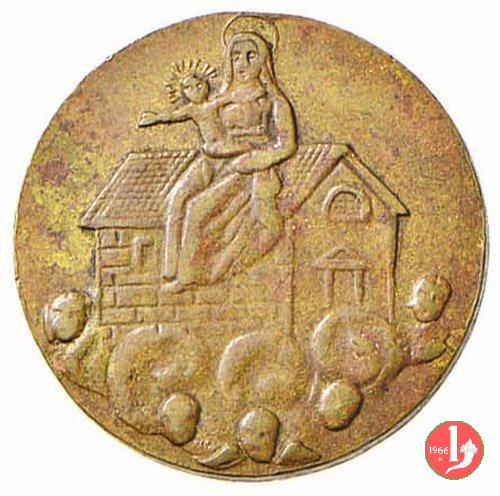 Santa Casa e Madonna di Loreto Obverse: MADONNA _ DI _ LORETO entro edicola ad arco: la Madonna di Loreto coronata e nimbata, con dalmatica, regge il Bambino Gesú sotto: * la Santa Casa su nubi e sorretta da due Angeli, sormontata dalla figura seduta della Madonna velata e nimbata che regge il Bambino Gesú con volto raggiante | |