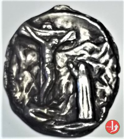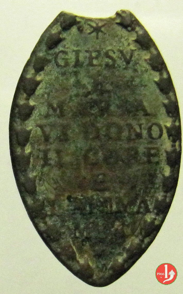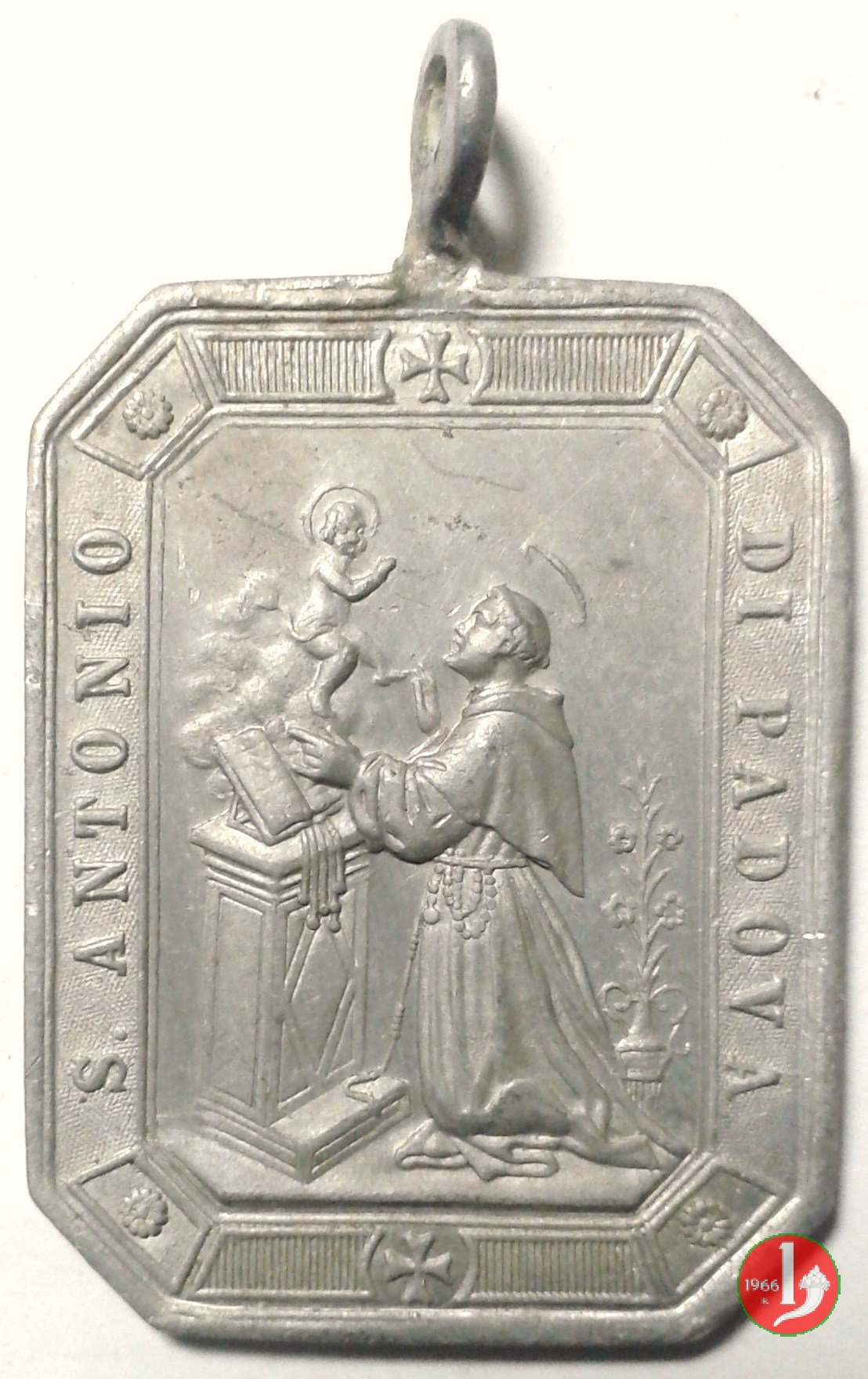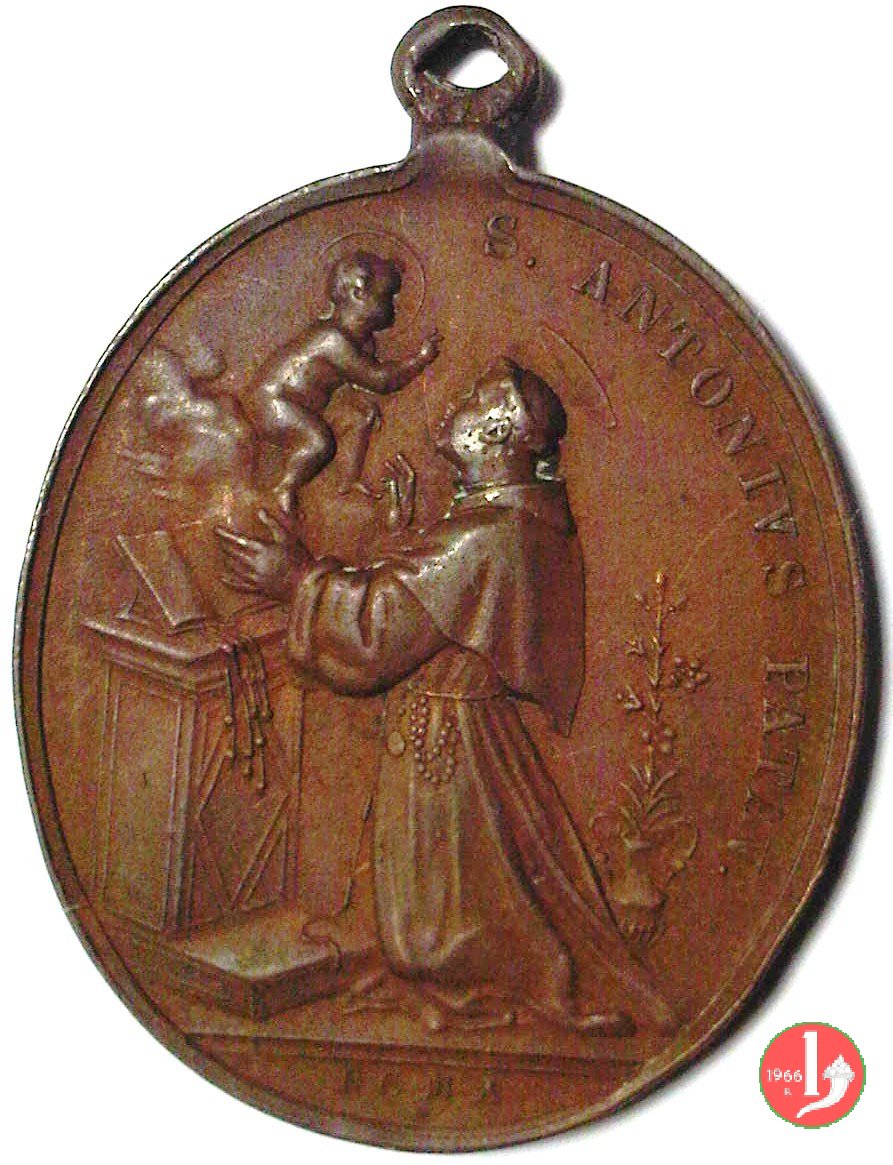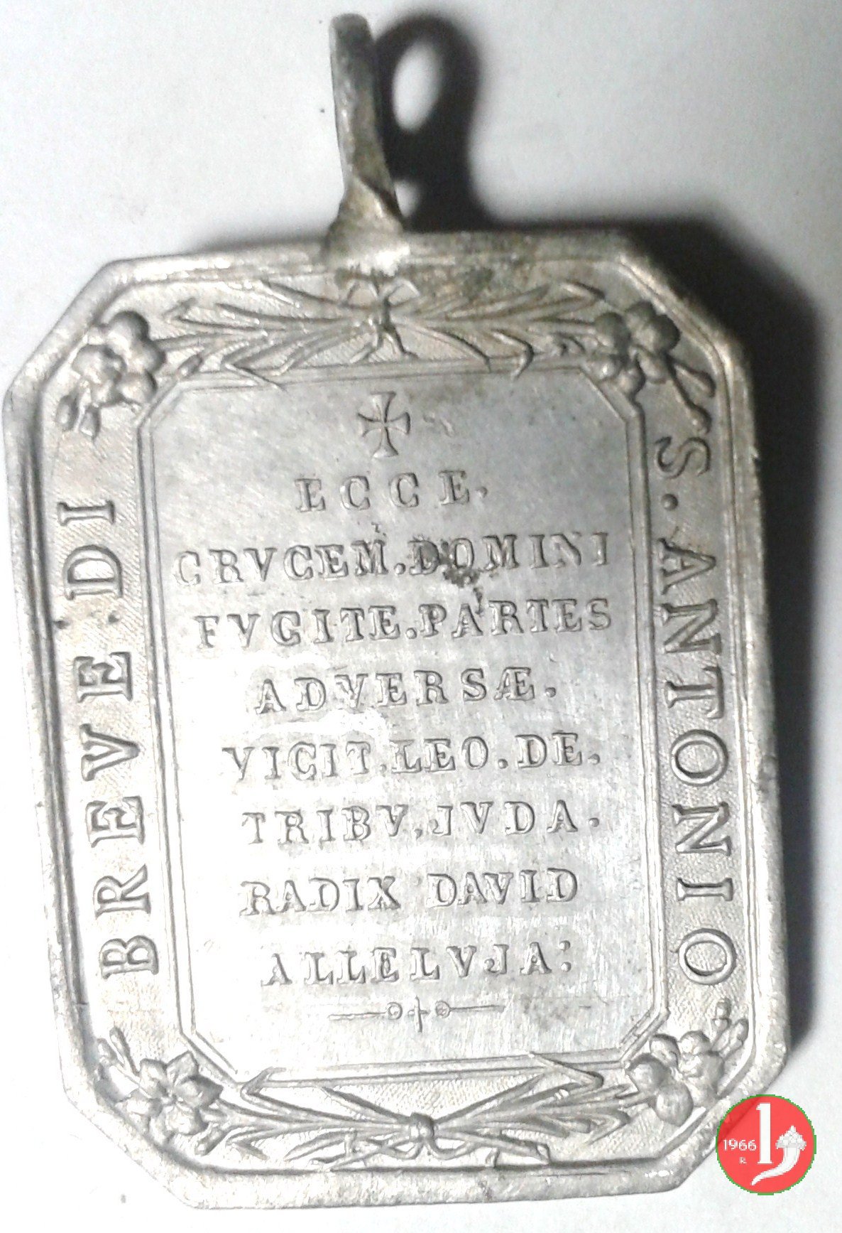 Breve di S. Antonio Obverse: ai lati di doppia cornice con Croci ai vertici superiori ed inferiori e fiori agli angoli: S. ANTONIO _ DI PADOVA Sant'Antonio con saio, nimbato e genuflesso verso sx, mira il Bambino Gesú benedicente su inginocchiatoio con libro aperto; a dx stelo di gigli entro vaso nel campo: ✠ = ECCE = CRVCEM. DOMINI = FVGITE. PARTES = ADVERSAE. = VINCIT. LEO. DE. = TRIBV. IVDA. = RADIX DAVID = ALLELVJA | |