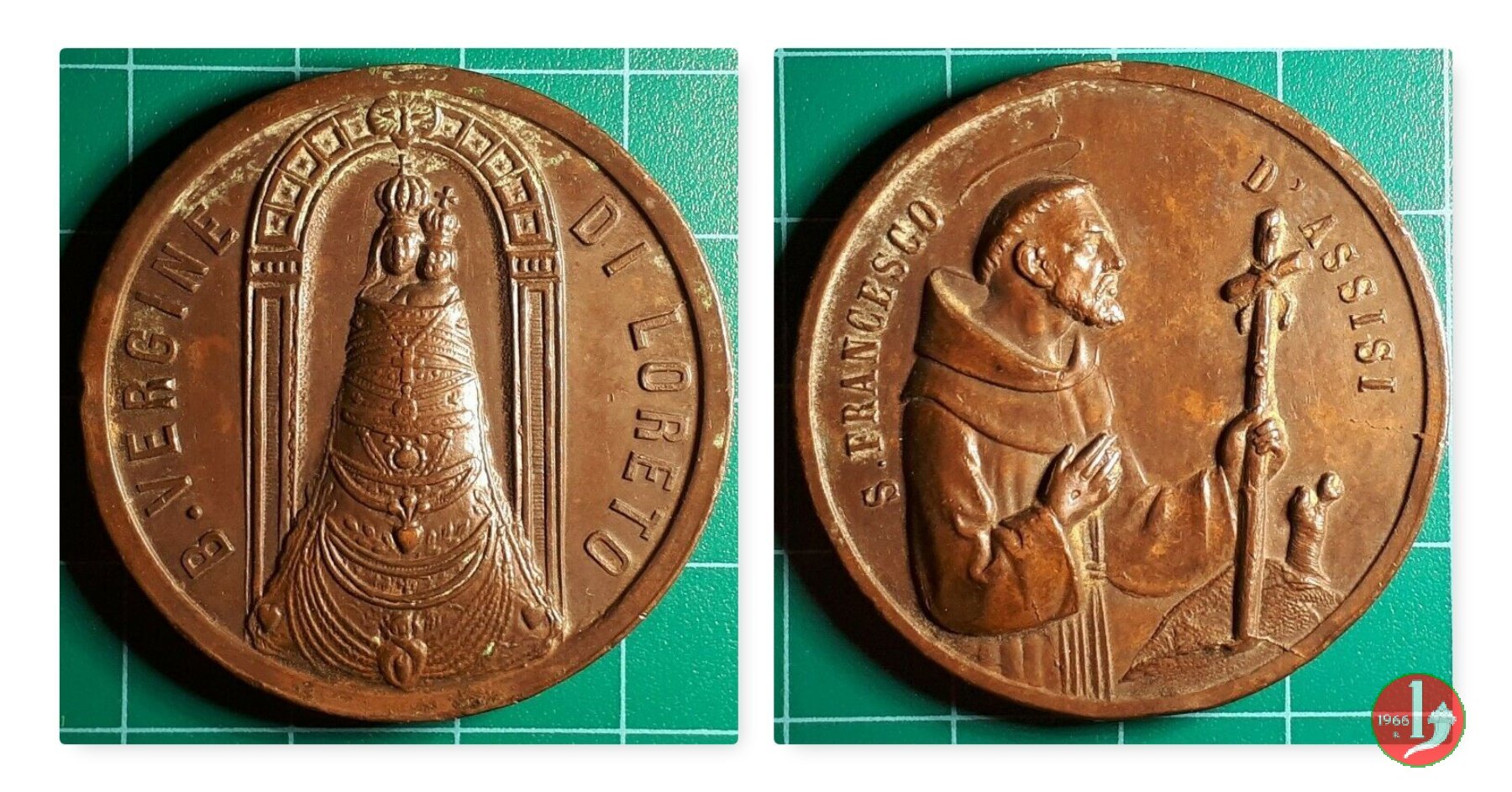 Madonna di Loreto e S. Francesco d'Assisi Obverse: B. VERGINE _ DI LORETO La Madonna di Loreto coronata con dalmatica con il Bambino Gesú coronato entro edicola ad arco sormontata da Colomba dello Spirito Santo raggiante busto a dx nimbato e con saio, regge Croce | |