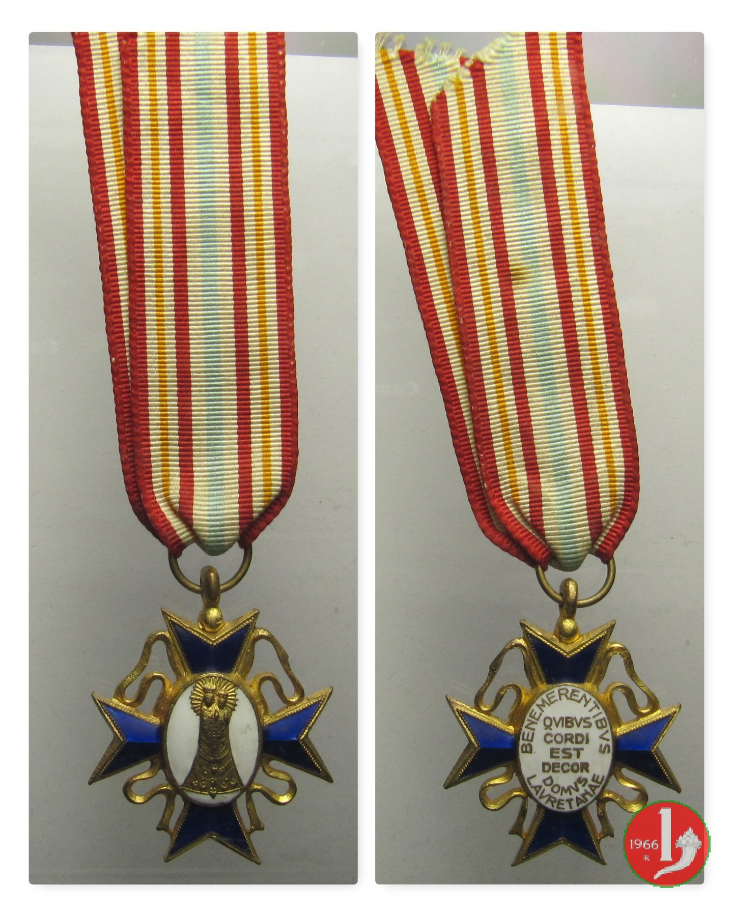 Croce di Benemerenza Lauretana Obverse: nella medaglia ovale: La Madonna di Loreto coronata e con volto raggiante in piedi e di fronte, regge il Bambino Gesú Reverse: nella medaglia ovale: BENEMERENTIBUS nel campo: QVIBVS = CORDI = EST = DECOR sotto circolarmente: DOMVS = LAVRETANAE | |