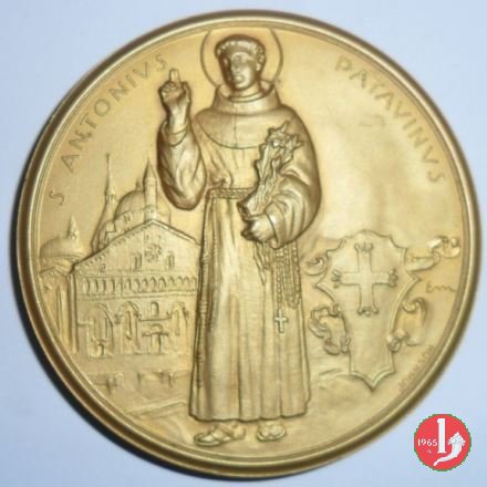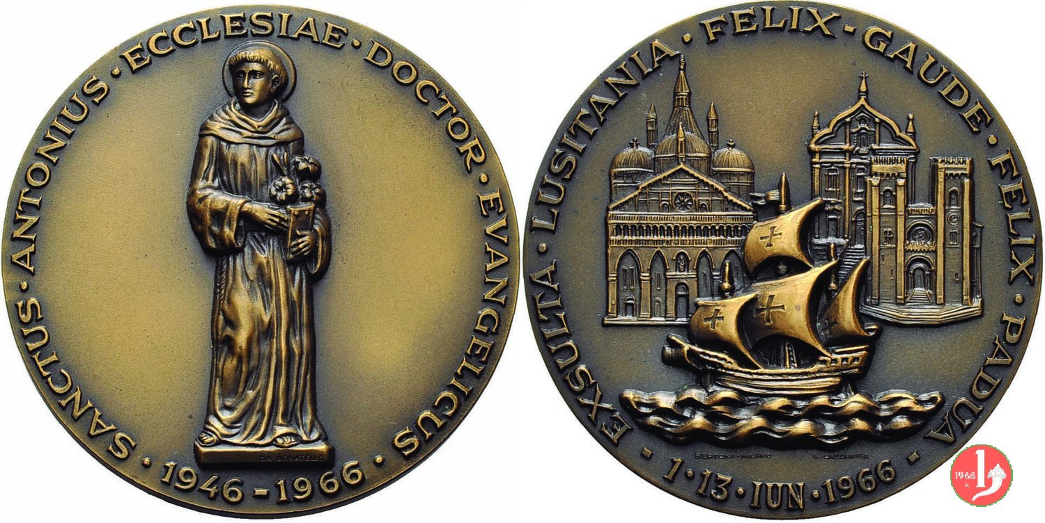20° Sant'Antonio Dottore della Chiesa 80mm 1966 Obverse: SANCTUS • ANTONIUS • ECCLESIA • DOCTOR • EVANGELICUS = - 1946-1966 - il Santo in piedi e di fronte, nimbato, regge stelo di gigli sul piedistallo: DA DONATELLO sotto a caravella in navigazione a sx: BERTONI-MILANO _ S. GAZZANICA |