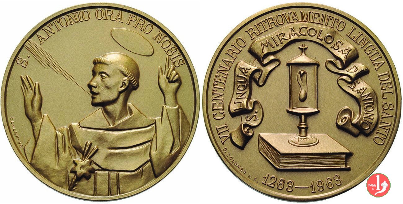 700° Ritrovamento Lingua di Sant'Antonio 1963 Obverse: S. _ ANTONIO ORA PRO NOBIS busto benedicente di 3/4 a sx con saio in basso: Stelo con giglio in basso a sx: CAVAGNINO in alto, entro nastro circolare: S. LINGUA MIRACOLOSA S. ANTONIO Reliquiario della Santa Lingua su tomo in basso: 1263-1963 in basso, a sx: D. COLOMBO E F. | |