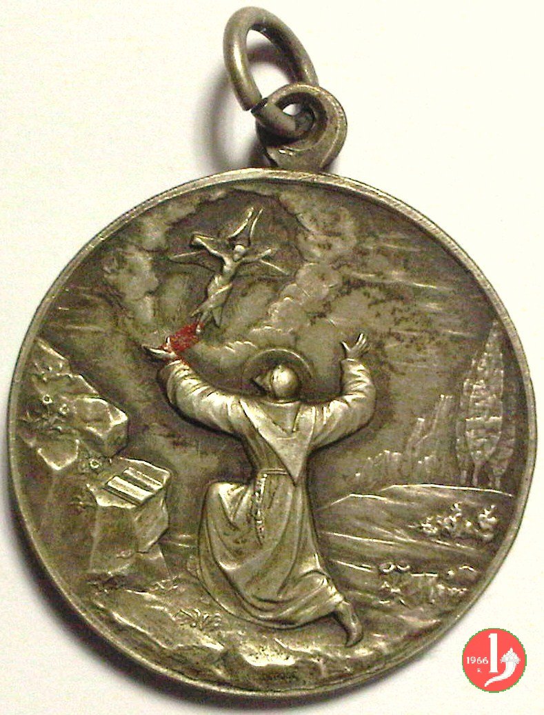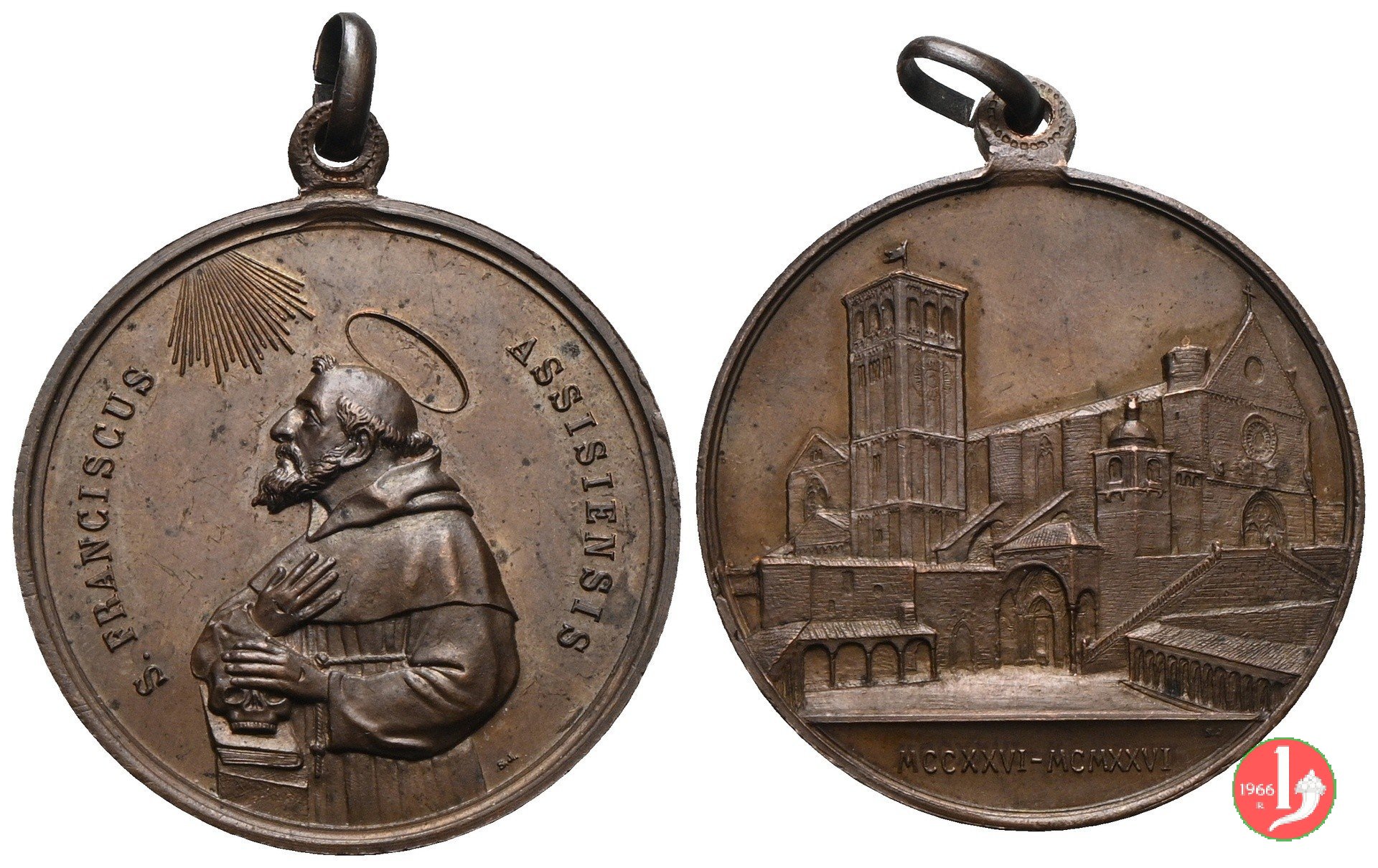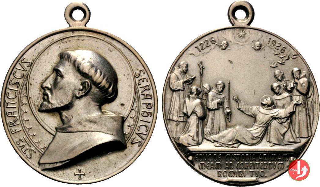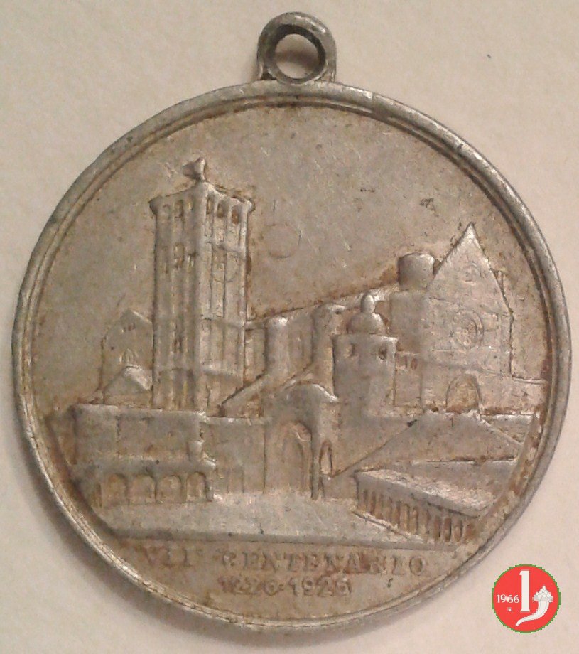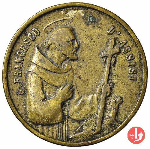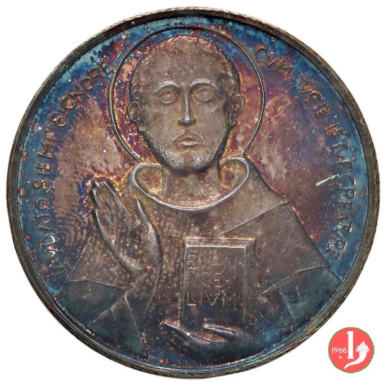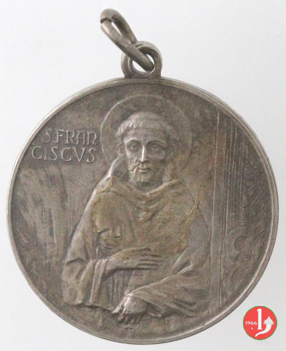 7° Centenario della morte 1926 Obverse: in alto a sx: MCCXXVI = MCMXXVI mezzo busto nimbato del Santo a dx con saio, mira raggi solari nel campo a dx: INTER COELI CHARISMATA = CHRISTI RECEPIT STIGMATA in basso a sx monogramma: PL = FE INC. in basso a dx: JOHNSON | |