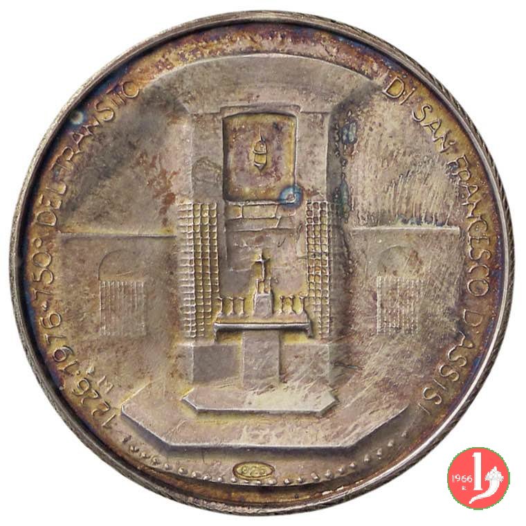 750° del Transito 1976 Obverse: 1226 1976 750° _ DEL TRANSITO DI SAN _ FRANCESCO D' ASSISI il Santo nimbato, in piedi, di fronte con saio, tra volo d'uccelli Il Santo nimbato, disteso e vegliato dai confratelli in basso: MANCINELLI | |